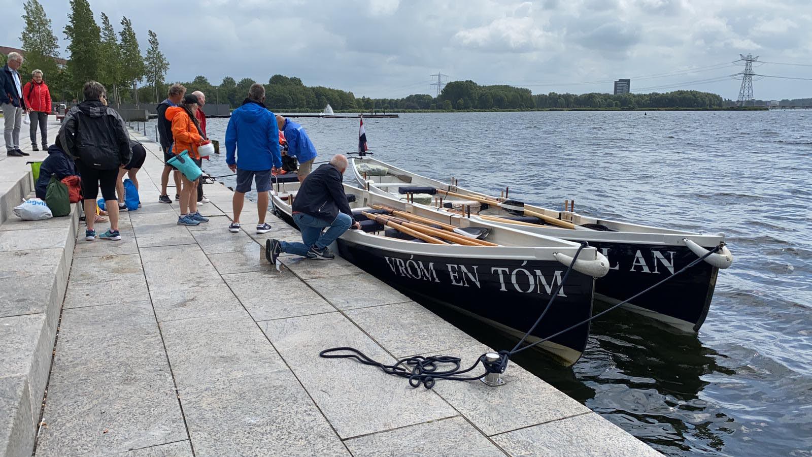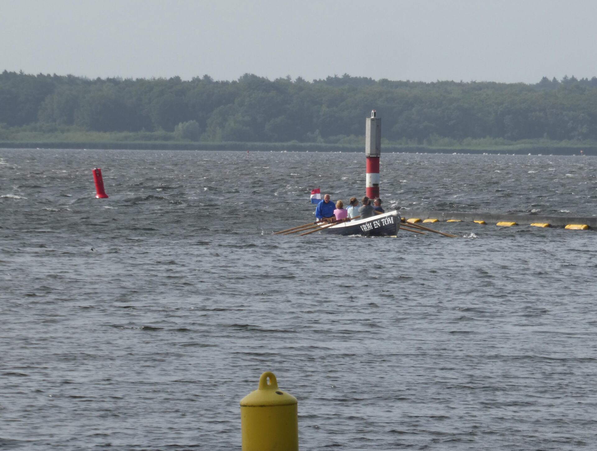 Stipt 9.00 uur: alle deelnemers op de steiger in de haven. De gigs lagen al klaar, op naar de palaver van Joyce. Alles duidelijk. Daarna iedereen op z’n bankje, bakboord of stuurboord: “slagklaar…riemen in het water “klaar en go”. De tocht begon. Vanuit het Huizerhoofd, het Gooimeer oversteken (windje in de rug) naar de sluis in Almere Haven. De sluis was al open, snel erin met de twee gigs en zakken maar. Een hele belevenis voor wie het nog niet eerder had meegemaakt.