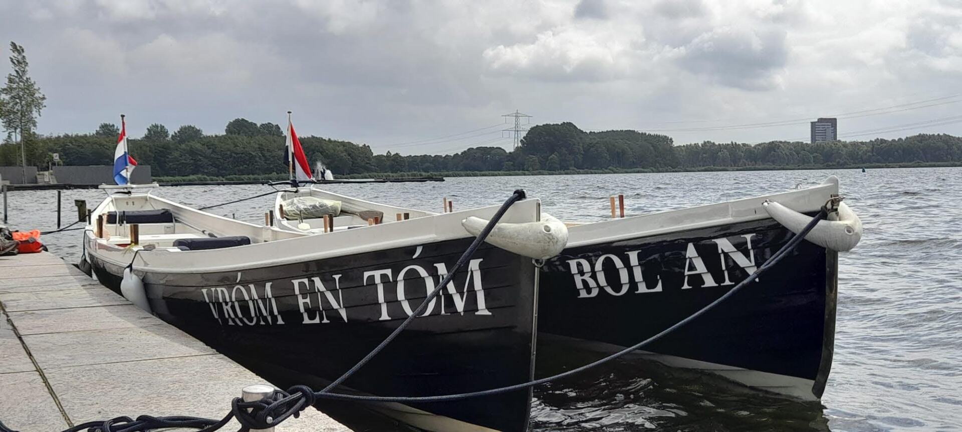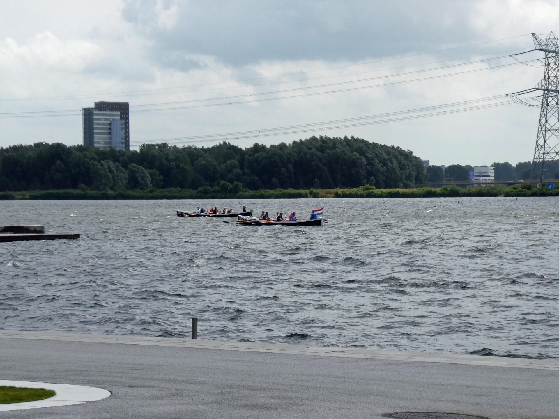 Met onze twee gigs, de Vrom en Tom en de Bol An vertrokken we met 12 roeiers en 2 stuurtjes om half tien ‘s morgens vanuit de haven richting Almere Haven om via de grote sluis verder te roeien naar Almere stad.