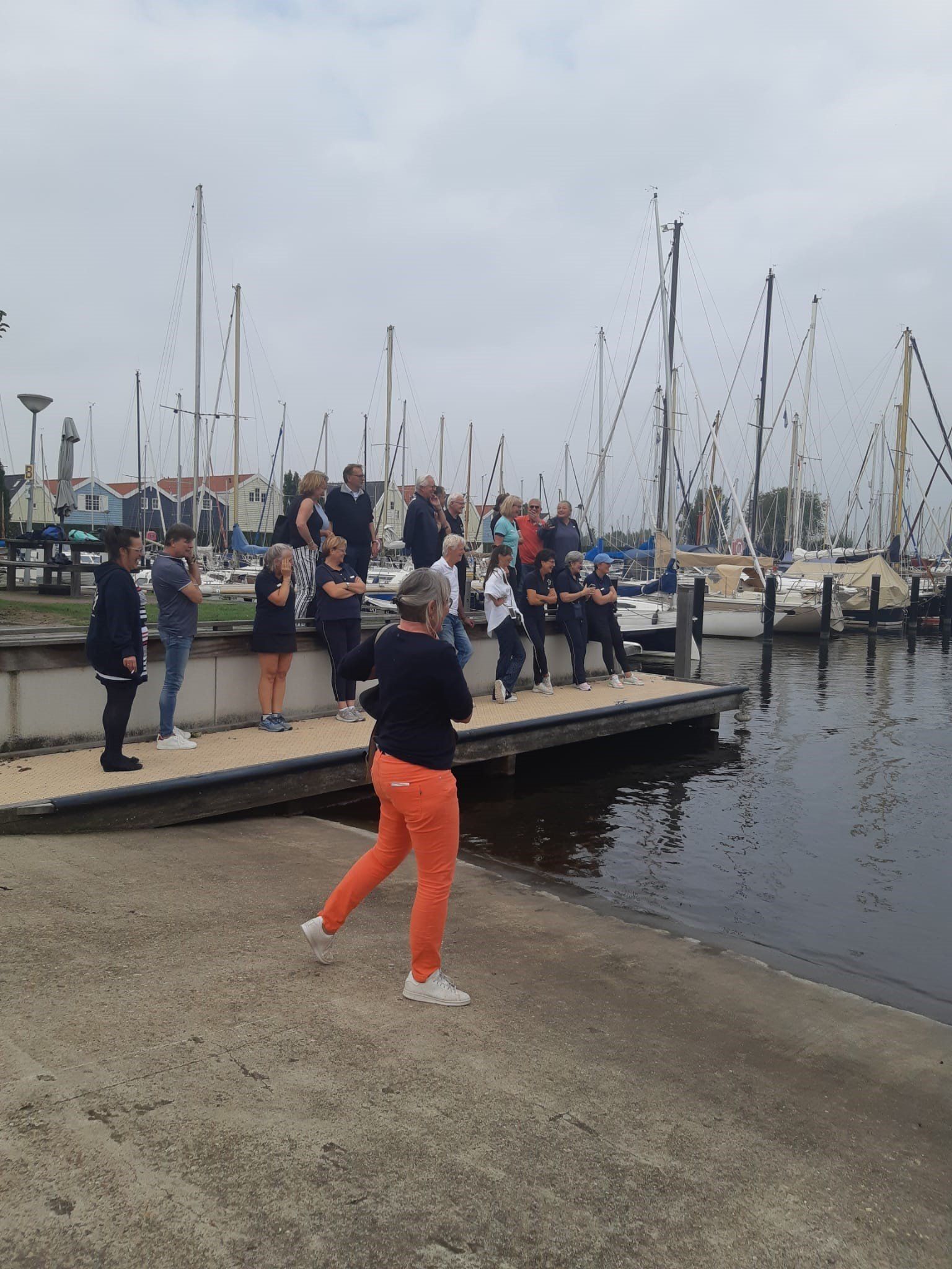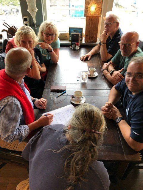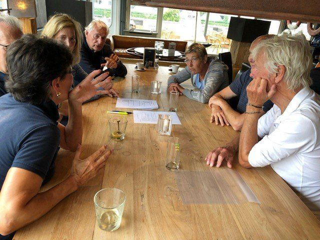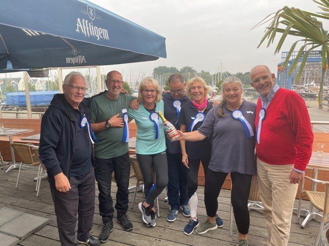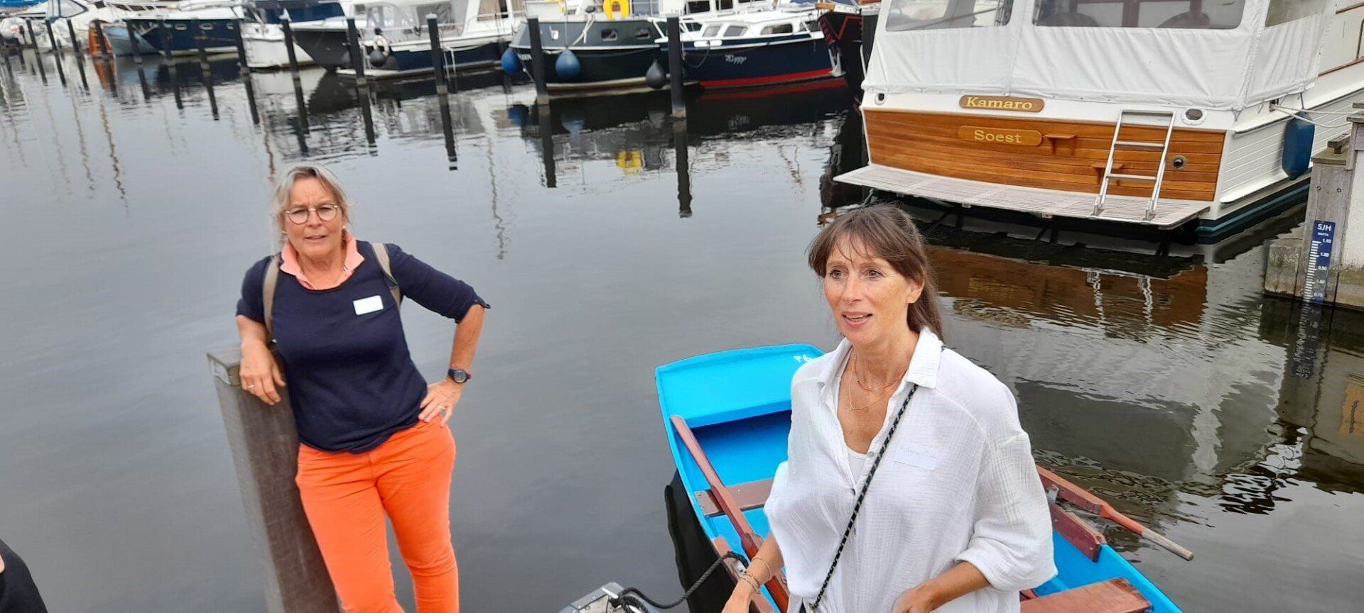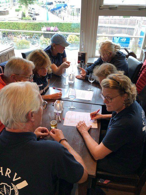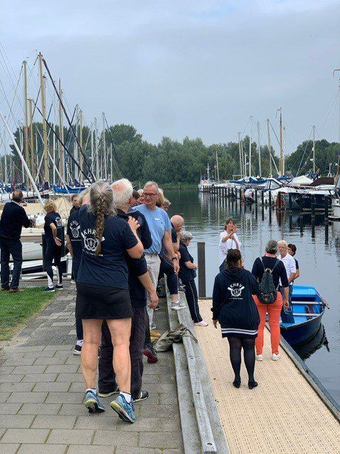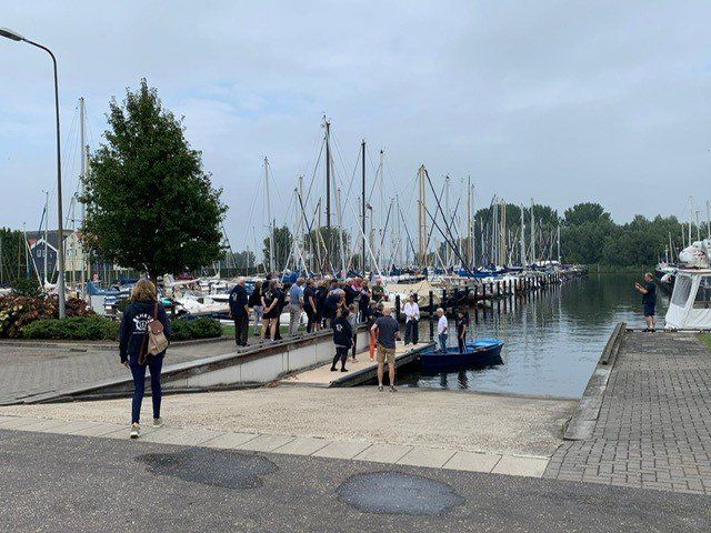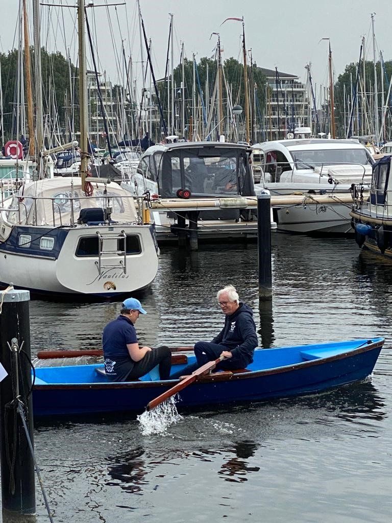 Stipt 9.00 uur: alle deelnemers op de steiger in de haven. De gigs lagen al klaar, op naar de palaver van Joyce. Alles duidelijk. Daarna iedereen op z’n bankje, bakboord of stuurboord: “slagklaar…riemen in het water “klaar en go”. De tocht begon. Vanuit het Huizerhoofd, het Gooimeer oversteken (windje in de rug) naar de sluis in Almere Haven. De sluis was al open, snel erin met de twee gigs en zakken maar. Een hele belevenis voor wie het nog niet eerder had meegemaakt.