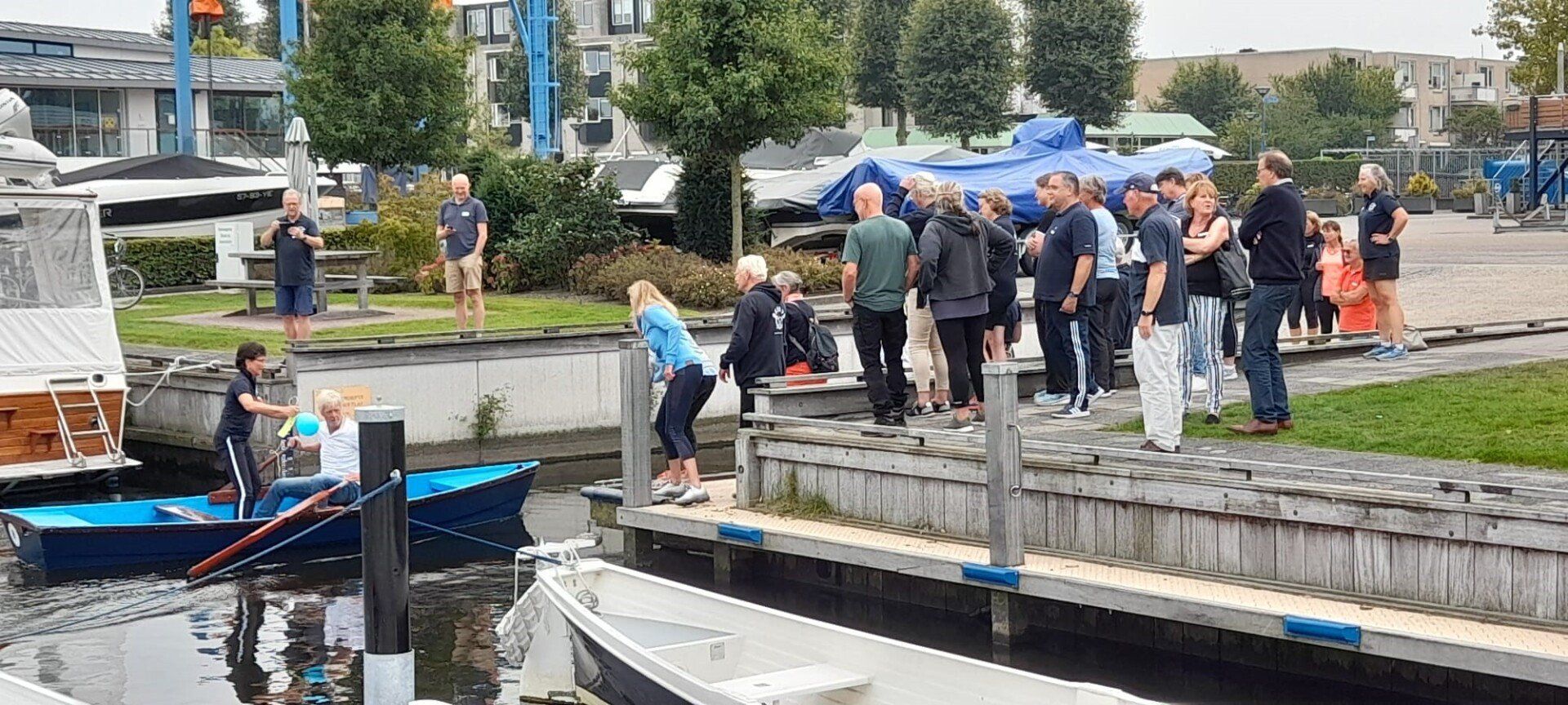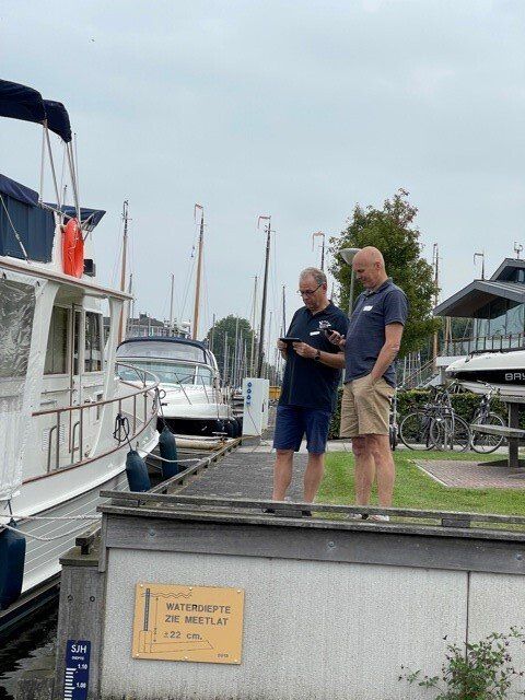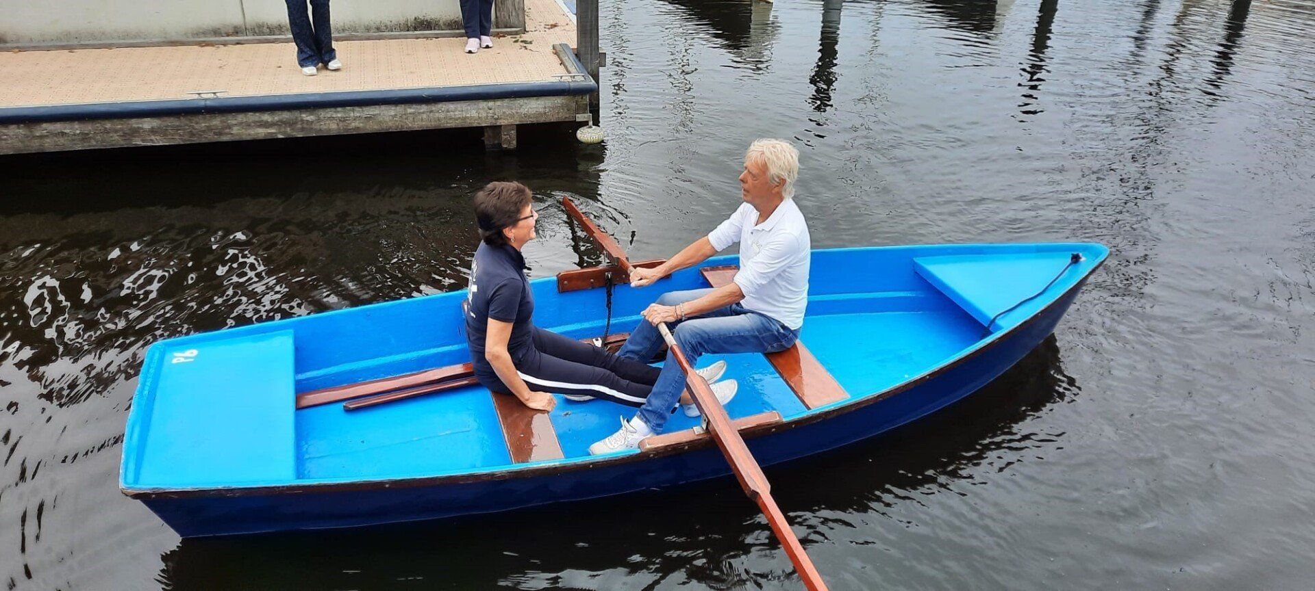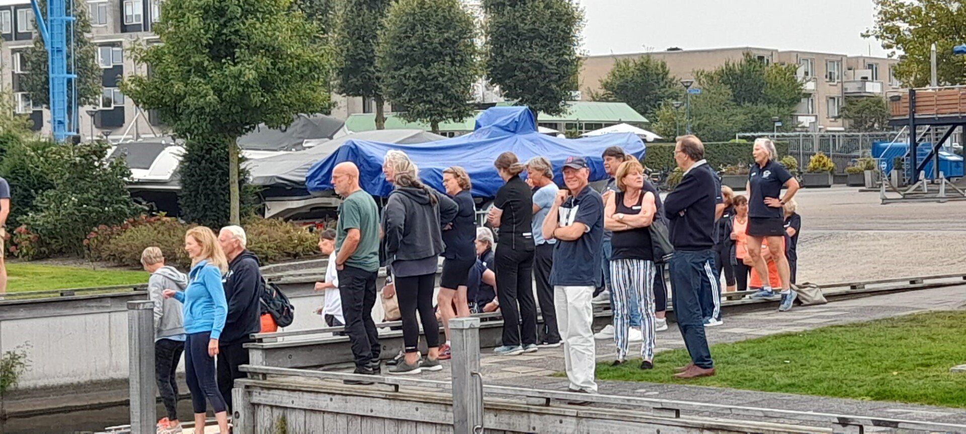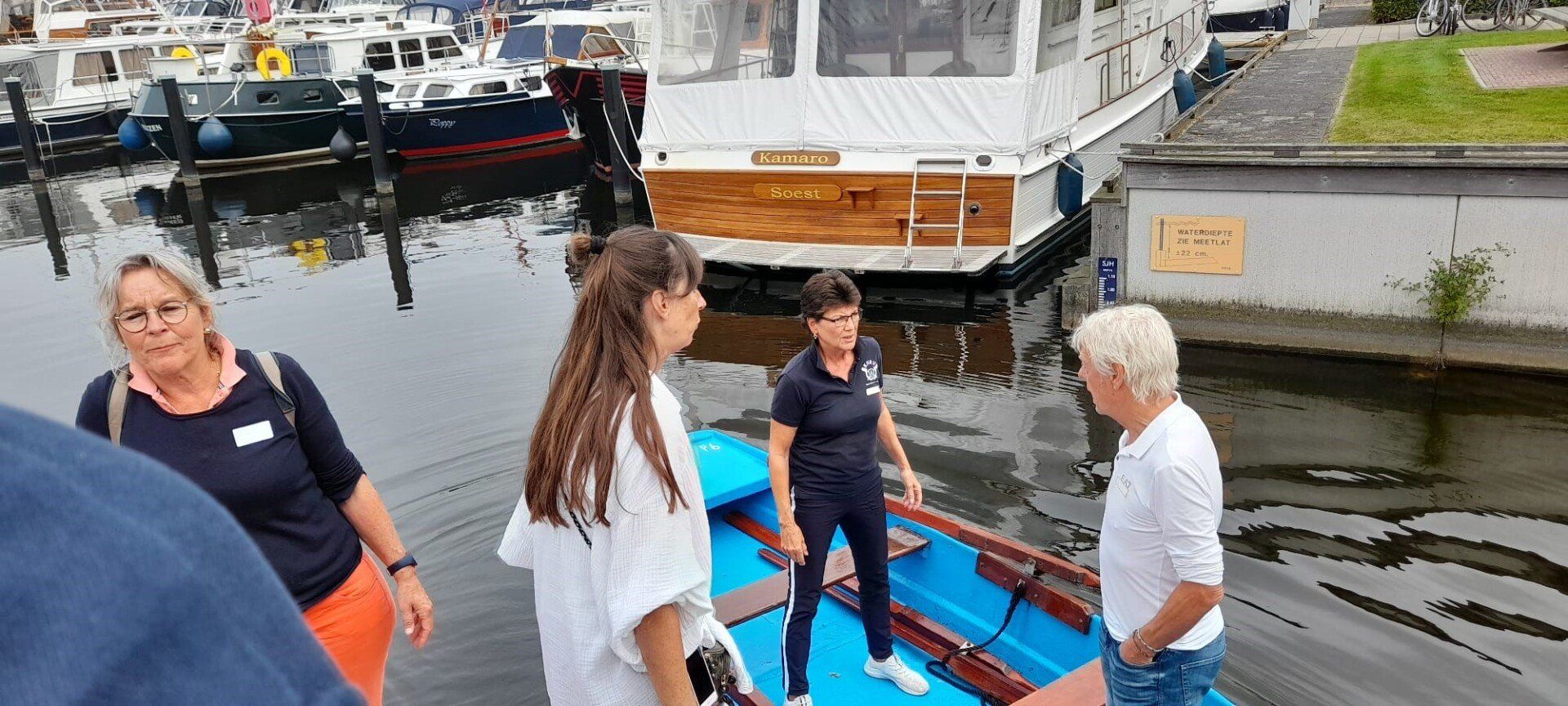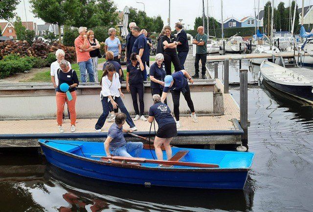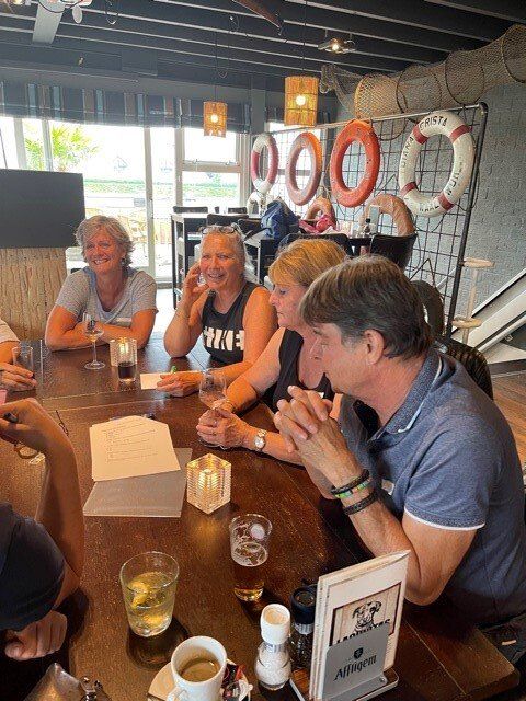 Stipt 9.00 uur: alle deelnemers op de steiger in de haven. De gigs lagen al klaar, op naar de palaver van Joyce. Alles duidelijk. Daarna iedereen op z’n bankje, bakboord of stuurboord: “slagklaar…riemen in het water “klaar en go”. De tocht begon. Vanuit het Huizerhoofd, het Gooimeer oversteken (windje in de rug) naar de sluis in Almere Haven. De sluis was al open, snel erin met de twee gigs en zakken maar. Een hele belevenis voor wie het nog niet eerder had meegemaakt.