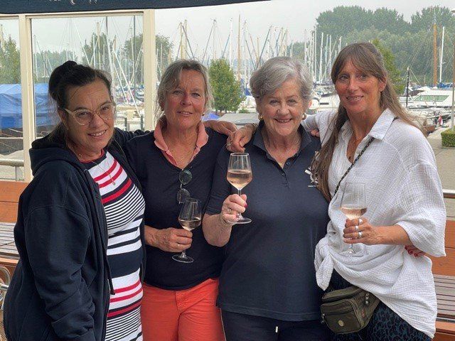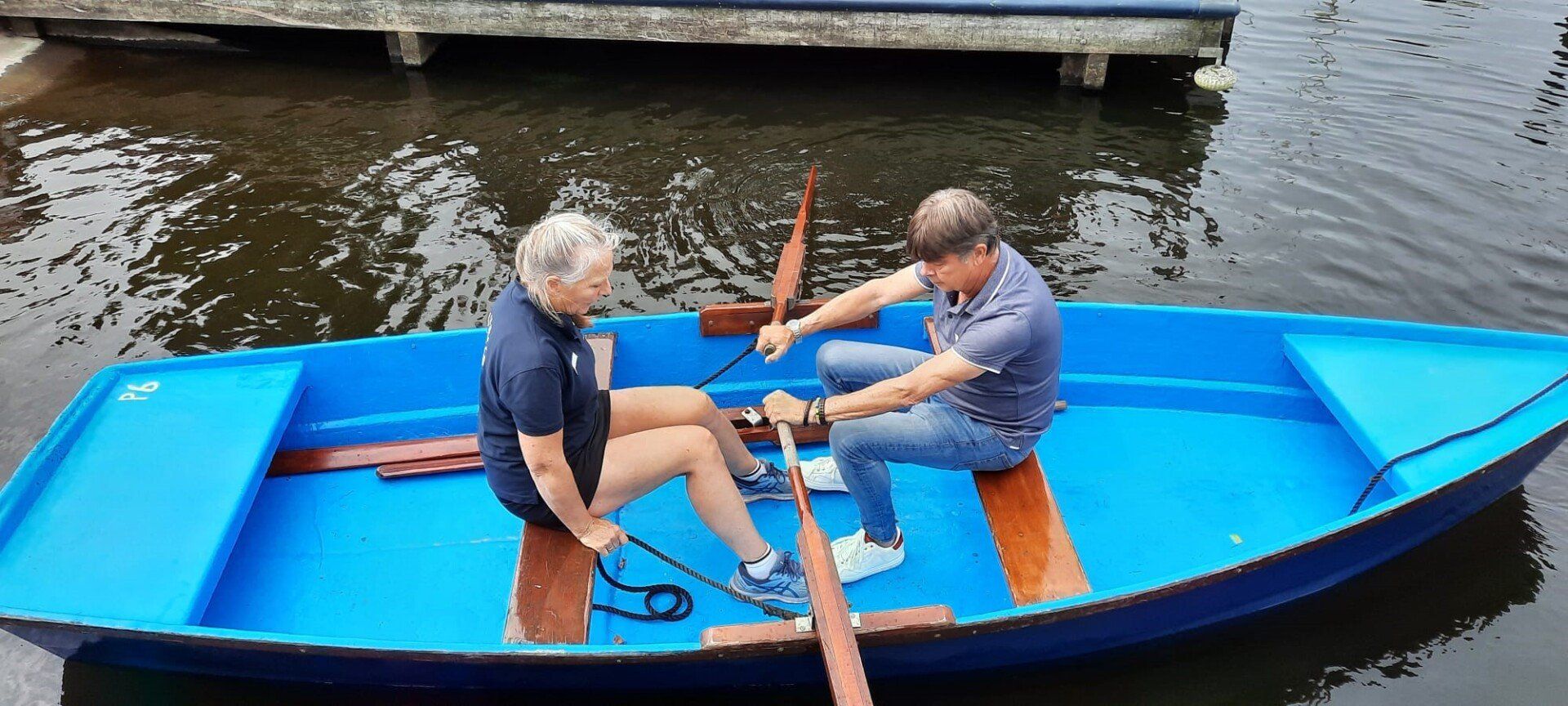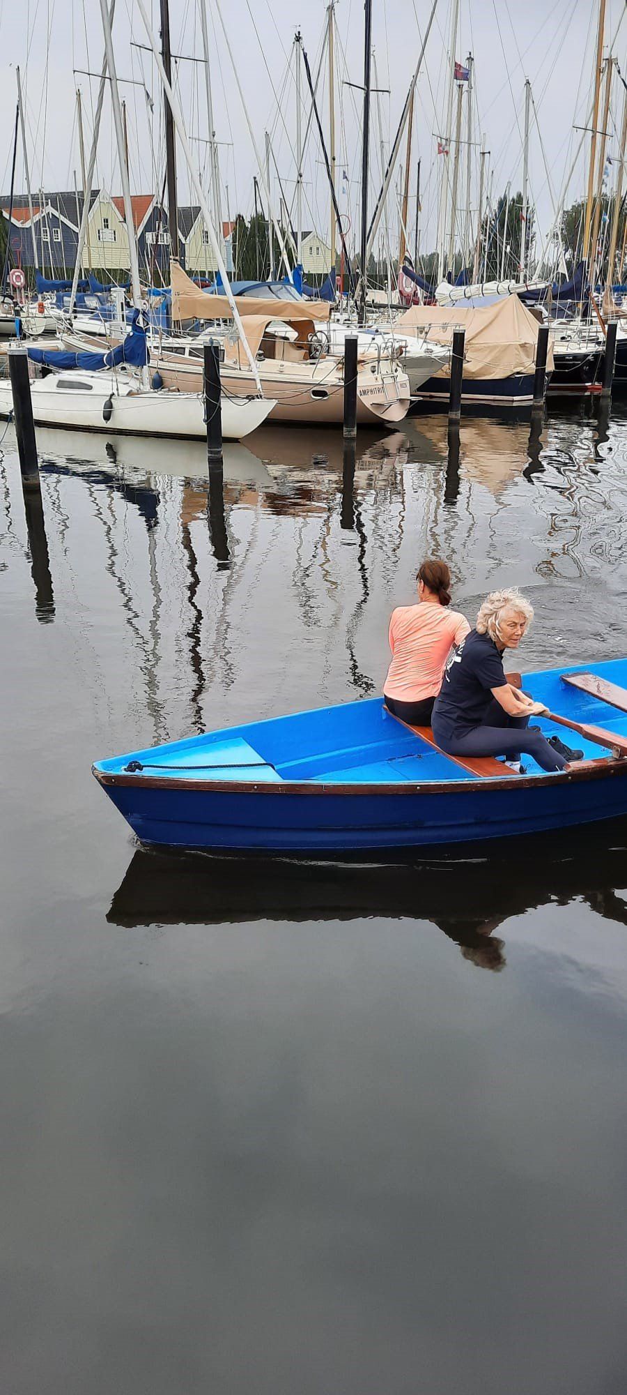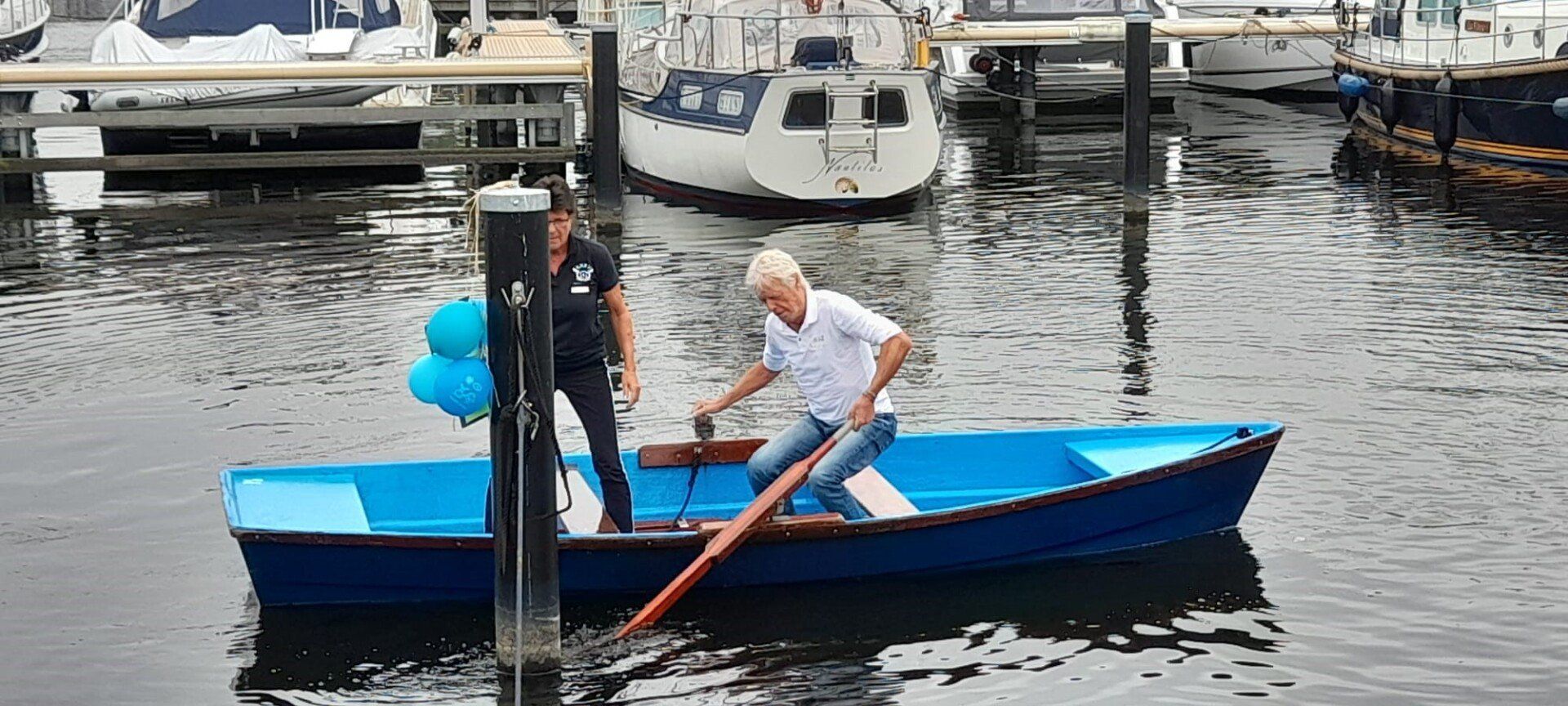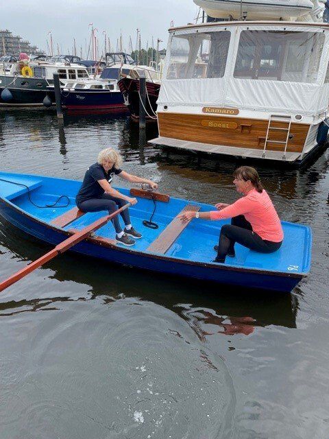 Stipt 9.00 uur: alle deelnemers op de steiger in de haven. De gigs lagen al klaar, op naar de palaver van Joyce. Alles duidelijk. Daarna iedereen op z’n bankje, bakboord of stuurboord: “slagklaar…riemen in het water “klaar en go”. De tocht begon. Vanuit het Huizerhoofd, het Gooimeer oversteken (windje in de rug) naar de sluis in Almere Haven. De sluis was al open, snel erin met de twee gigs en zakken maar. Een hele belevenis voor wie het nog niet eerder had meegemaakt.