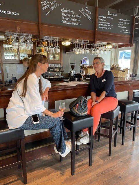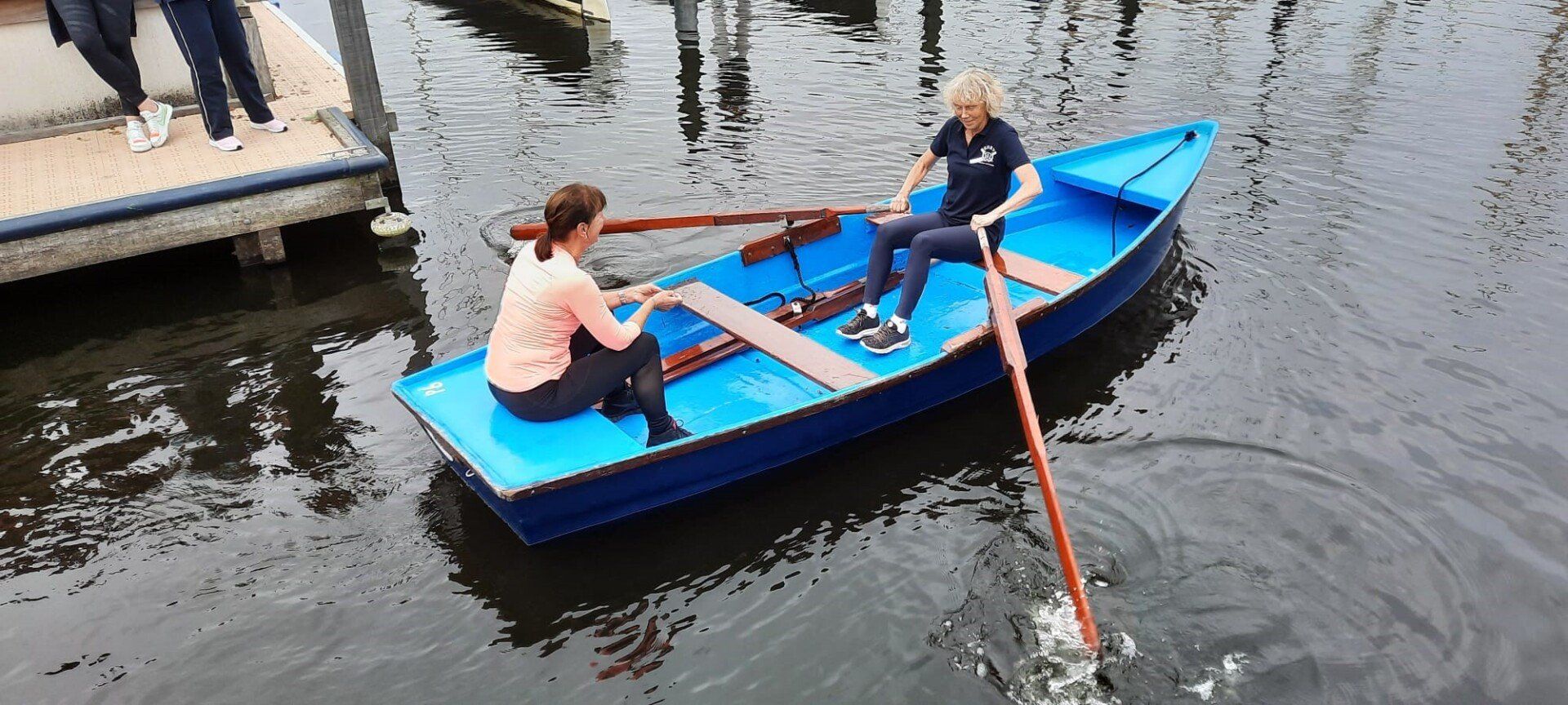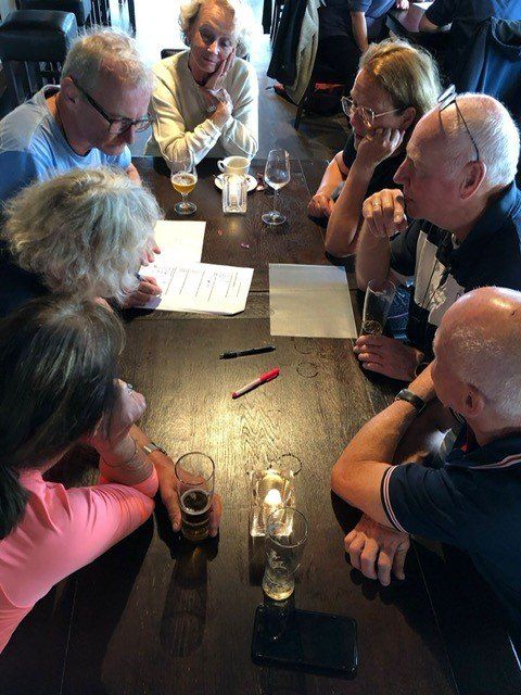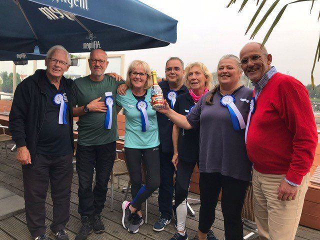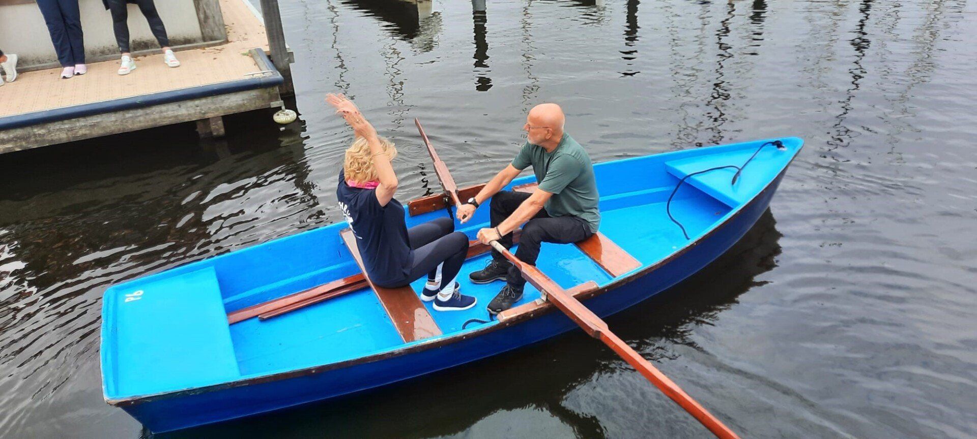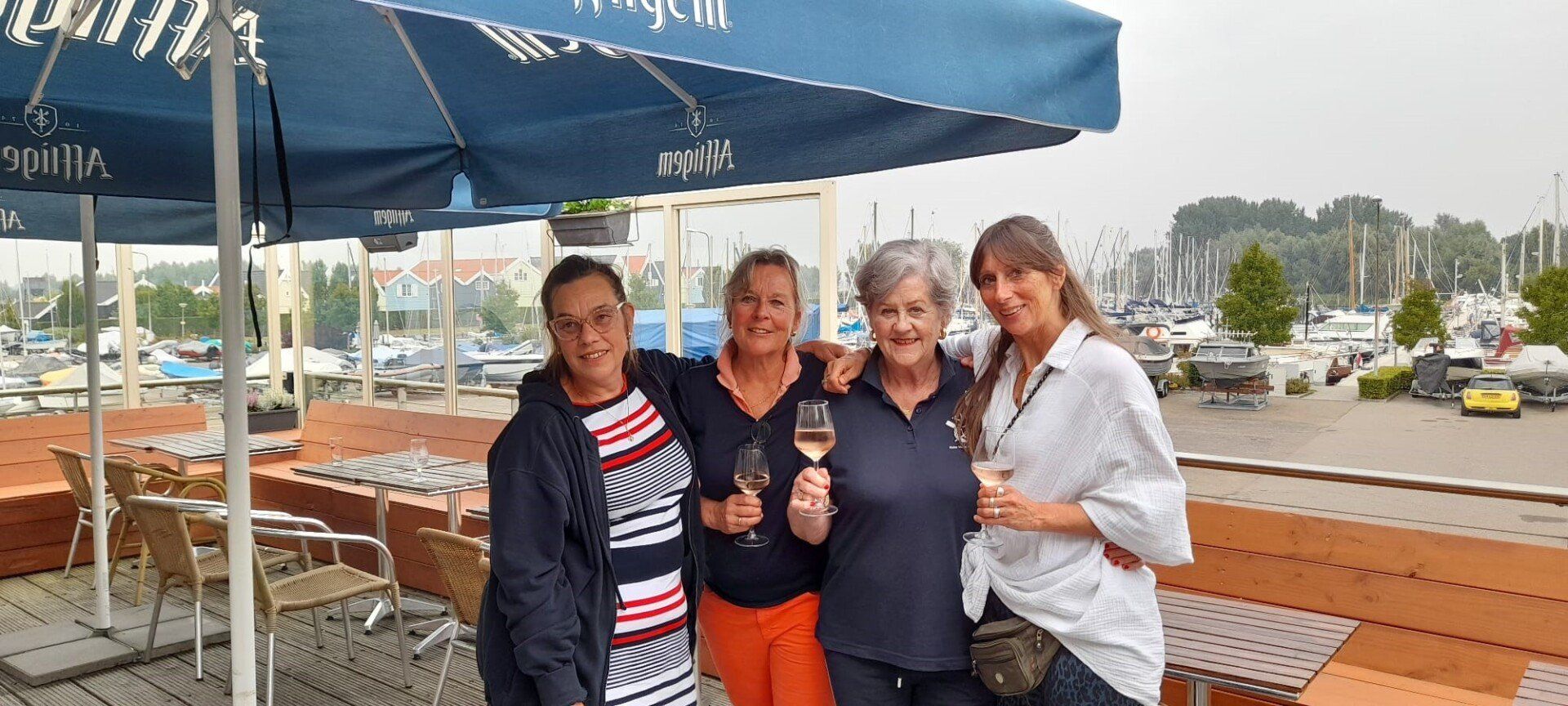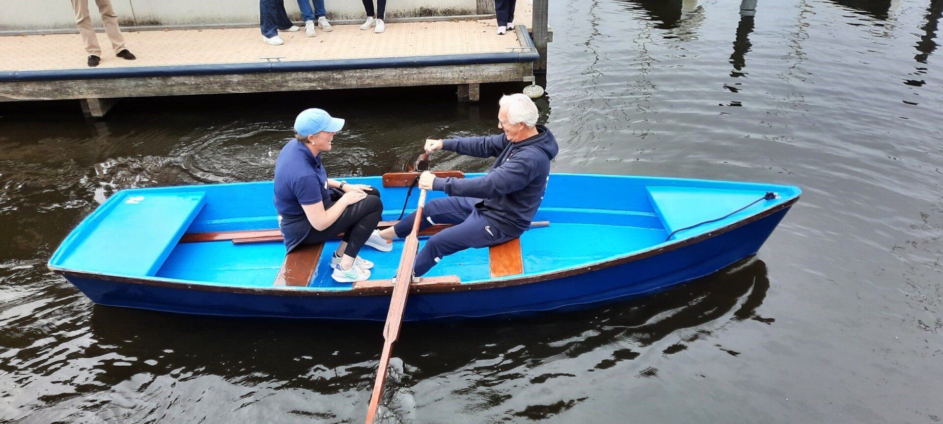 Stipt 9.00 uur: alle deelnemers op de steiger in de haven. De gigs lagen al klaar, op naar de palaver van Joyce. Alles duidelijk. Daarna iedereen op z’n bankje, bakboord of stuurboord: “slagklaar…riemen in het water “klaar en go”. De tocht begon. Vanuit het Huizerhoofd, het Gooimeer oversteken (windje in de rug) naar de sluis in Almere Haven. De sluis was al open, snel erin met de twee gigs en zakken maar. Een hele belevenis voor wie het nog niet eerder had meegemaakt.