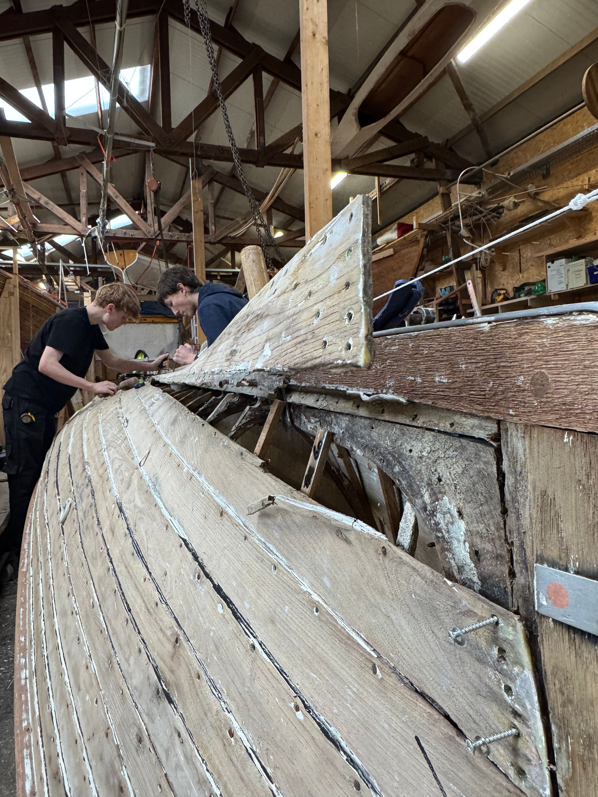 Surprise! Ja hoor, de gig lag eindelijk op z’n kop, klaar om de slechte huidgangen te gaan vervangen. Maar ook werd een kleine tegenvaller voor ons zichtbaar. Dachten we klaar te zijn met oude verflagen wegschrapen. Nou, niet dus. De onderranden van de vele huidgangen lieten niet alleen veel donkerblauwe en witte verflagen, maar ook nogal wat kitlagen zien. Dus terwijl twee stagiaires zich bezighielden met het losmaken van de eerste huidgang zochten wij onze verfschrapers maar weer op. Na intensief verf wegschrapen hebben we ook aandacht besteed aan de oude vlonders. Deze hebben we netjes op de grond uitgelegd om te overleggen hoe we de restauratie van deze delen gaan aanpakken. Onze leermeester stelt voor om de goede delen te behouden en de slechte delen te kopiëren. Daartoe zal hij red cedar hout aankopen. Wij zullen later moeten kiezen met welke coating en in welke kleur we de vlonders en de spoorstokken gaan schilderen. Ook kregen we vandaag ons nieuwe roer met het verzoek deze alvast mee te willen nemen. Wel gevraagd of ze de resten van het oude roer weer willen assembleren zodat we dit later in een mogelijk eigen clubhuis kunnen plaatsen. Onze dag sloten we af met een bezoekje van enkele KHRV bestuursleden. Zij toonden grote belangstelling voor het proces en de geleverde kwaliteit van het werk. Benieuwd wat ons de komende week te wachten staat. Het gaat in ieder geval de goede kant op.