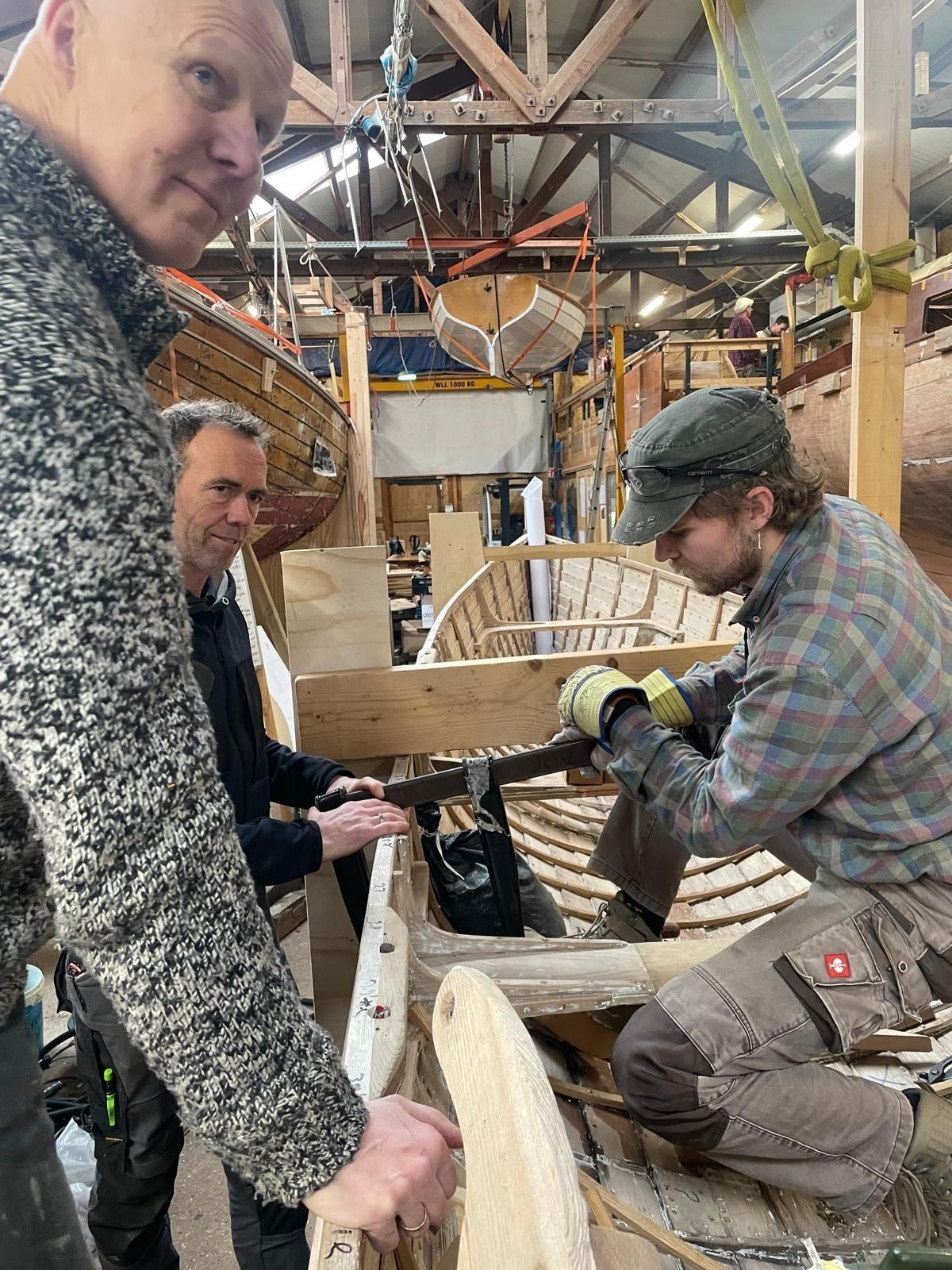 Vrijdag de 13e. Een enorme drukte in en om de gig. Er waren vandaag veel cursisten ingezet. Zo werd er gewerkt aan de mallen, aan de binnen en de buitenzijde van de gig. De gig stond niet helemaal waterpas en moest opnieuw gesteld worden, waarna de mallen opnieuw gefixeerd konden worden. Ook aan de kant van de spiegel werd gewerkt. Daar waren enkele van de laatste spanten vervangen. Maar omdat de huidgangen eerder al van de spiegel losgemaakt waren, kwam er nu met de nieuwe vastgeklonken spanten spanning op de huidgangen te staan, waardoor de opening tussen de huidgangen en de spiegel wat groter leek te zijn geworden. Daarom werd besloten deze spanten weer te verwijderen en een nieuwe buitenmal te maken om de huidgangen tegen de spiegel gedrukt te houden. Pas als dat gebeurd is kunnen de laatste nieuwe spanten op het achterschip geplaatst en vastgeklonken worden. Midscheeps moest nog één nieuw spant geplaatst worden. Probleem was echter dat het nieuwe spant niet de contouren van en huidgangen volgde en er dus nog een keer gestoomd moest worden. Eerst werd het spant aan stuurboordzijde op de huidgangen vastgeklonken en met een z.g. gripnail op de kiel vastgezet. Vervolgens werd er om het nog losse deel van het spant een plastic zak gevouwen waarop vervolgens een stoomapparaat werd aangesloten. Na een half uurtje stomen ging de zak er af en werd ook dat deel aan de huidgangen vastgeklonken. Hier werd de z.g. Noorse methode gebruikt waarmee m.b.v. een dolly of een hamer aan de binnenzijde van de gig genageld werd terwijl aan de buitenzijde de klap van de dolly of hamer met een andere hamer opgevangen werd. Ondertussen werden er ook nog wat witte verflagen van de huidgangen geschraapt. We naderen het moment dat alle slechte spanten vervangen zijn. De komende week is ABC vanwege de krokusvakantie gesloten. Daarna zullen de laatste spanten door ABC cursisten geplaatst worden. In die week zal ook met wat extra KHRV mankracht geprobeerd worden om zoveel mogelijk de nog aanwezige witte verfresten weg te schrapen. Daarna zal de gig op z'n kop gekeerd worden om de rotte huidgangen te vervangen.