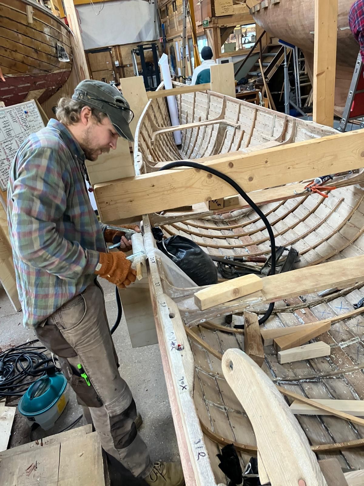 We zijn inmiddels een klein maandje verder en in het nieuwe jaar beland. Een maand waarin niet echt veel gebeurd is, mede vanwege de kerstsluiting bij ABC en het best wel heftige winterweer van de afgelopen week. Toch telde ik nu totaal achttien nieuwe spanten in de boot, netjes vastgeklonken op de huidgangen. In de aflakruimte van ABC lagen nog vijf genummerde afgelakte spanten klaar, dus deze meegenomen naar de gig. Op de betreffende posities, opnieuw gewapend met een multitool met zaagblad, een drevel en een hamer, de oude slechte spanten verwijderd om vervolgens de oude wiggen daaronder weg te halen en de huidgangen netjes schoon te schrapen.Tot slot de gig nog met de stofzuiger goed uitgezogen. Vanwege andere verplichtingen voor de vereniging, me vandaag halverwege de middag afgemeld. ABC kan nu maandag verder met het plaatsen van de nieuwe spanten. Ook moet er door ABC nog wat extra hout ingekocht worden om nog een paar spanten te kunnen stomen en buigen, waarna het moment dichterbij komt dat we de gig kunnen omkeren om de slechte huidgangen te vervangen.