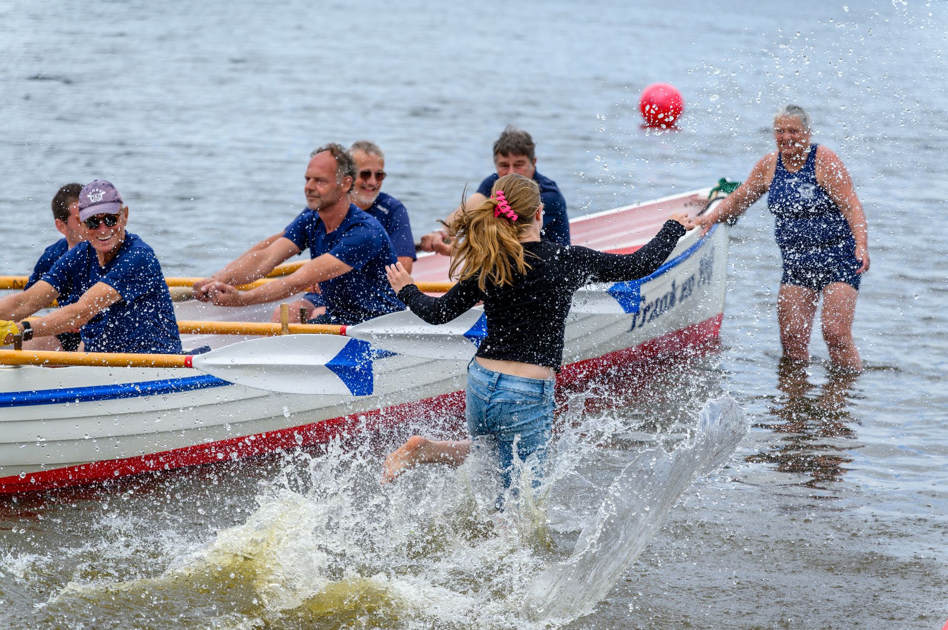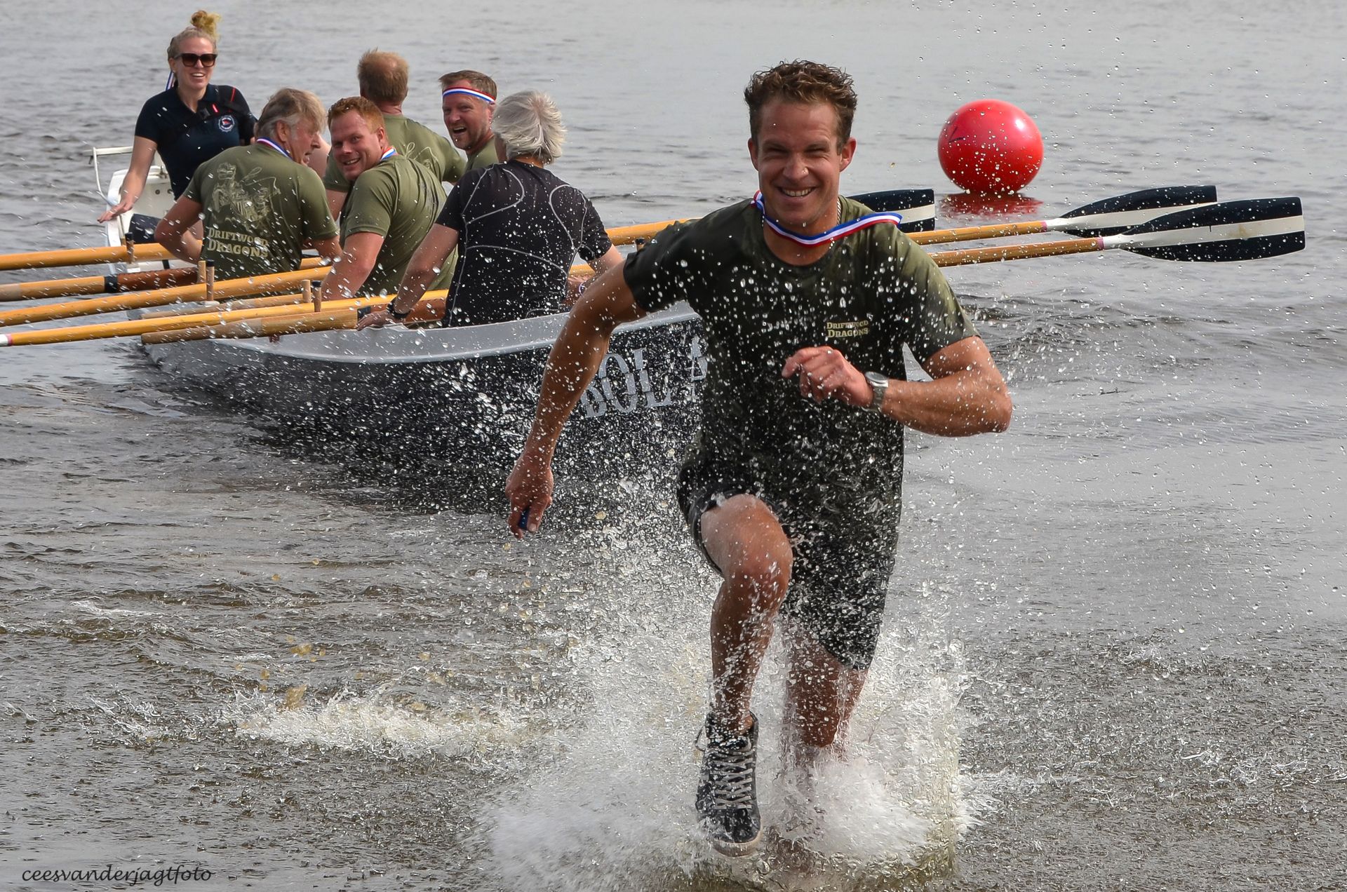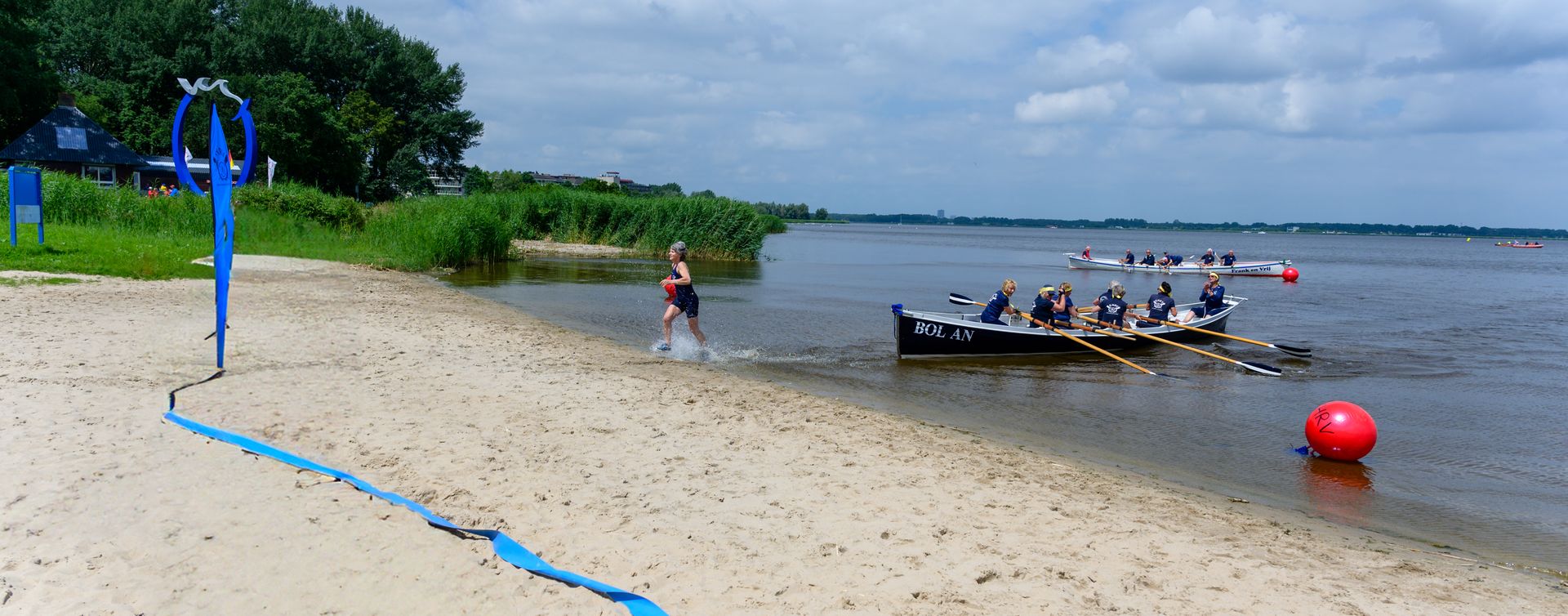 De eerste wedstrijd is een estafette: twee teams roeien na elkaar in dezelfde boot een ronde van 2,5 kilometer. Start, wissel en finish zijn op het strand: per team is er telkens 1 roeier die vanaf het strand naar de boot rent en bij de wissel uit de boot naar het strand komt. Dat leverde bijzondere acties op!