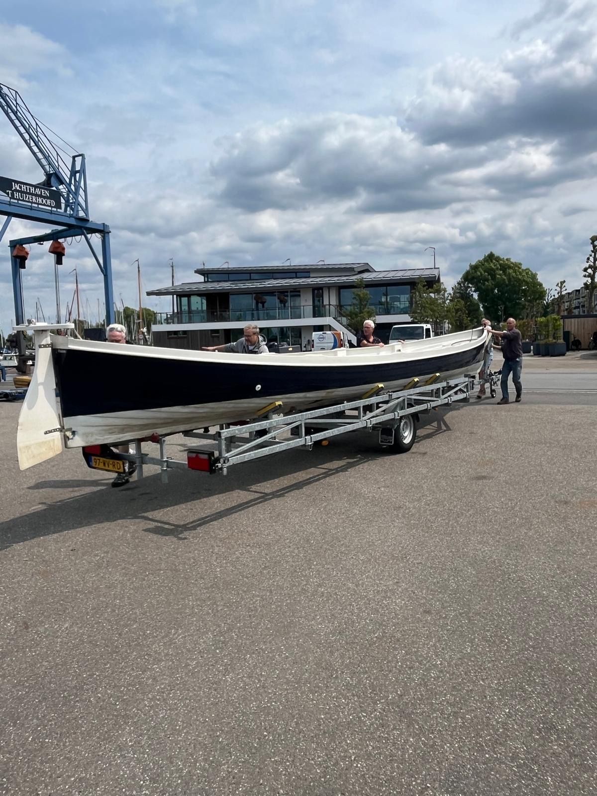 Na een het drogen, in de lentezon en wat buien glom de gig als nieuw. De romp was strak, de waterlijn scherp. Hierna kon de boot weer gedraaid worden en op de trailer getild. Gelukkig kwamen er net roeiers terug van hun vaartocht en waren er voldoende handjes beschikbaar om de gig weer op z’n kiel op de autobanden te draaien waarna de boot weer op de trailer werd gezet.