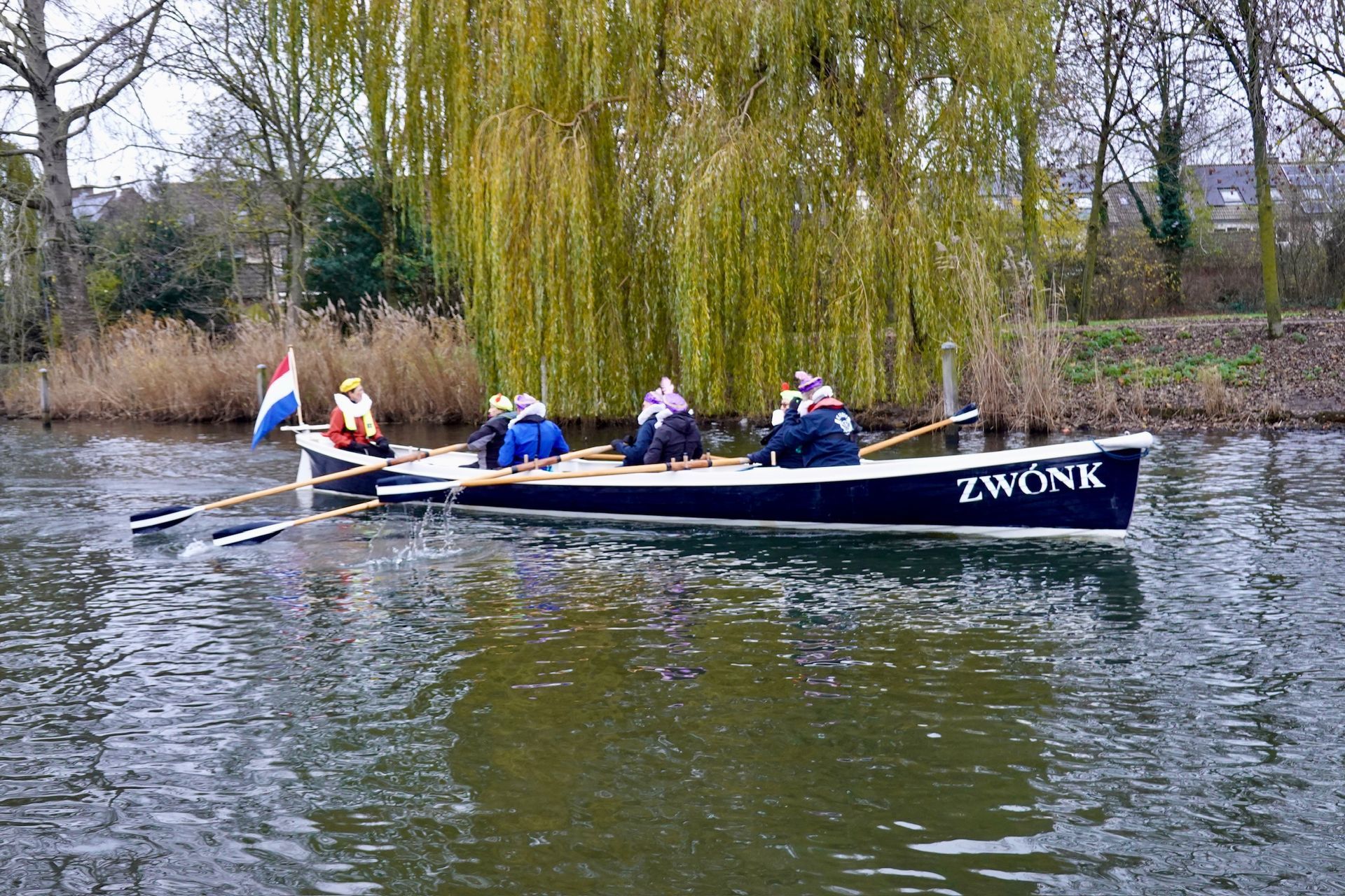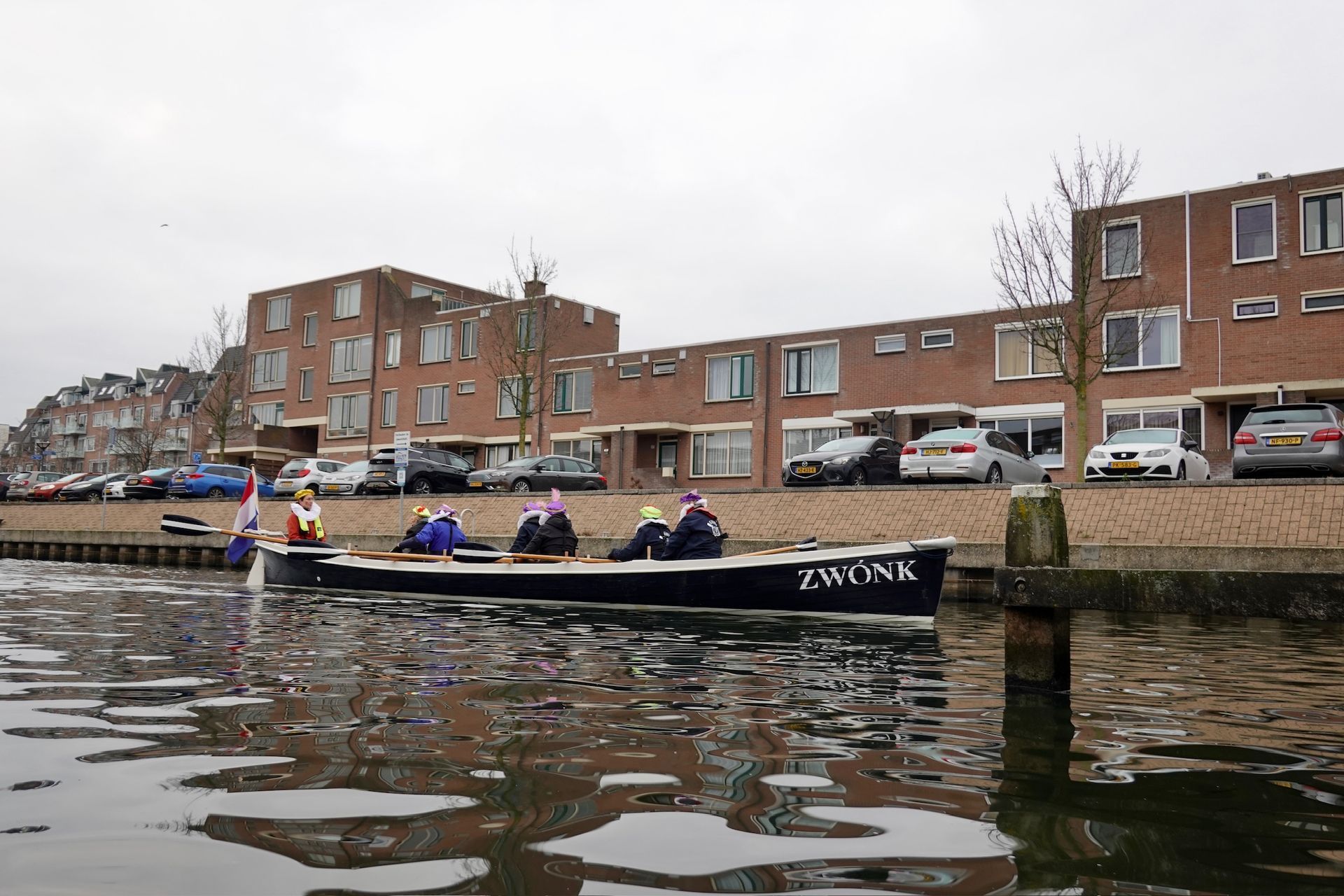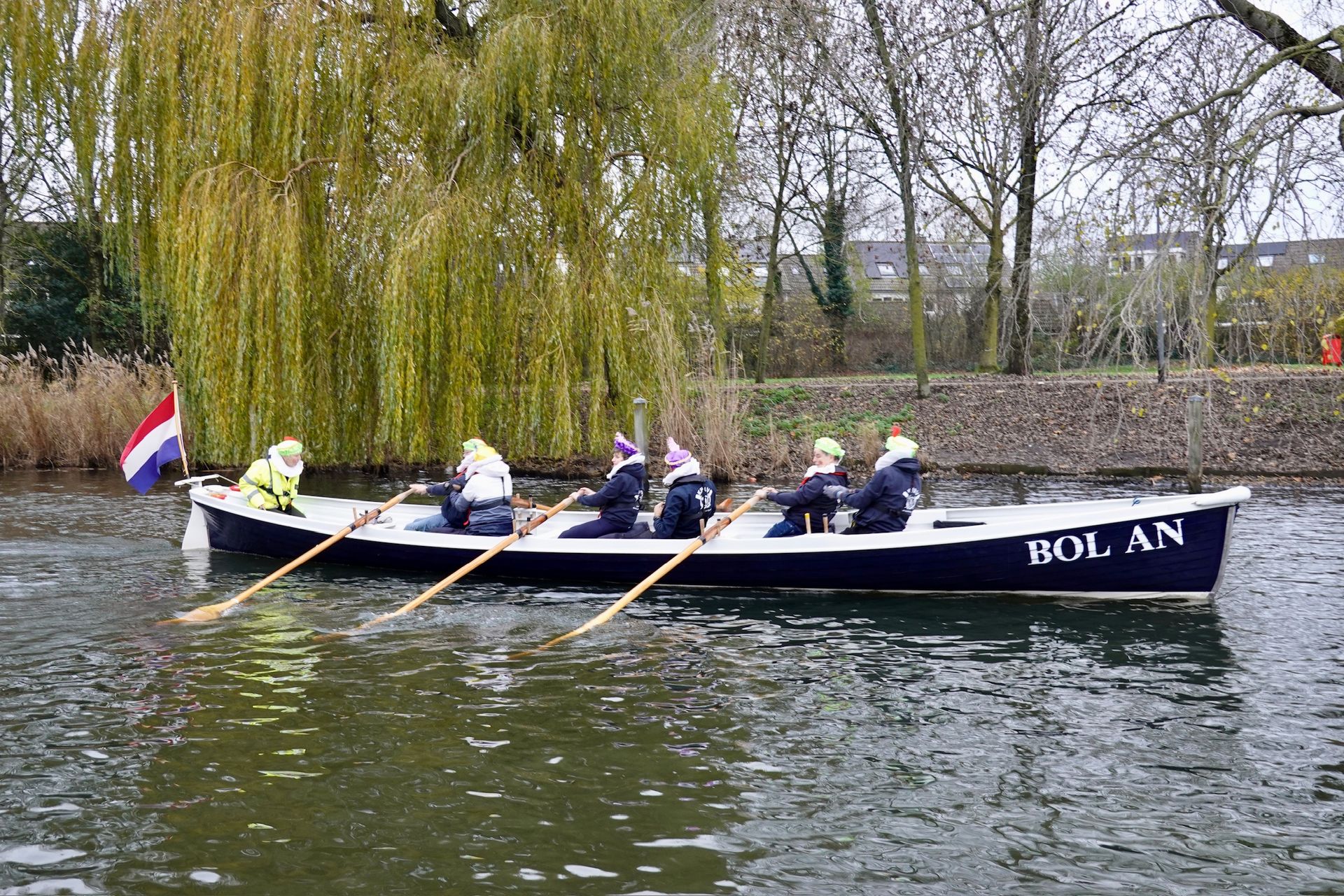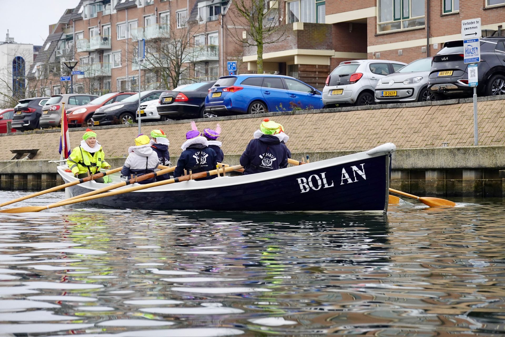 De traditionele roeiboten trokken al van verre de aandacht. Terwijl de pieten in strak ritme de riemen door het water haalden, klonk er gezang, gelach en af en toe het kenmerkende geluid van een zak pepernoten die werd opgeschud. Toeschouwers langs de kade zwaaiden enthousiast, en vooral kinderen keken vol verwondering naar het vrolijke schouwspel op het water.