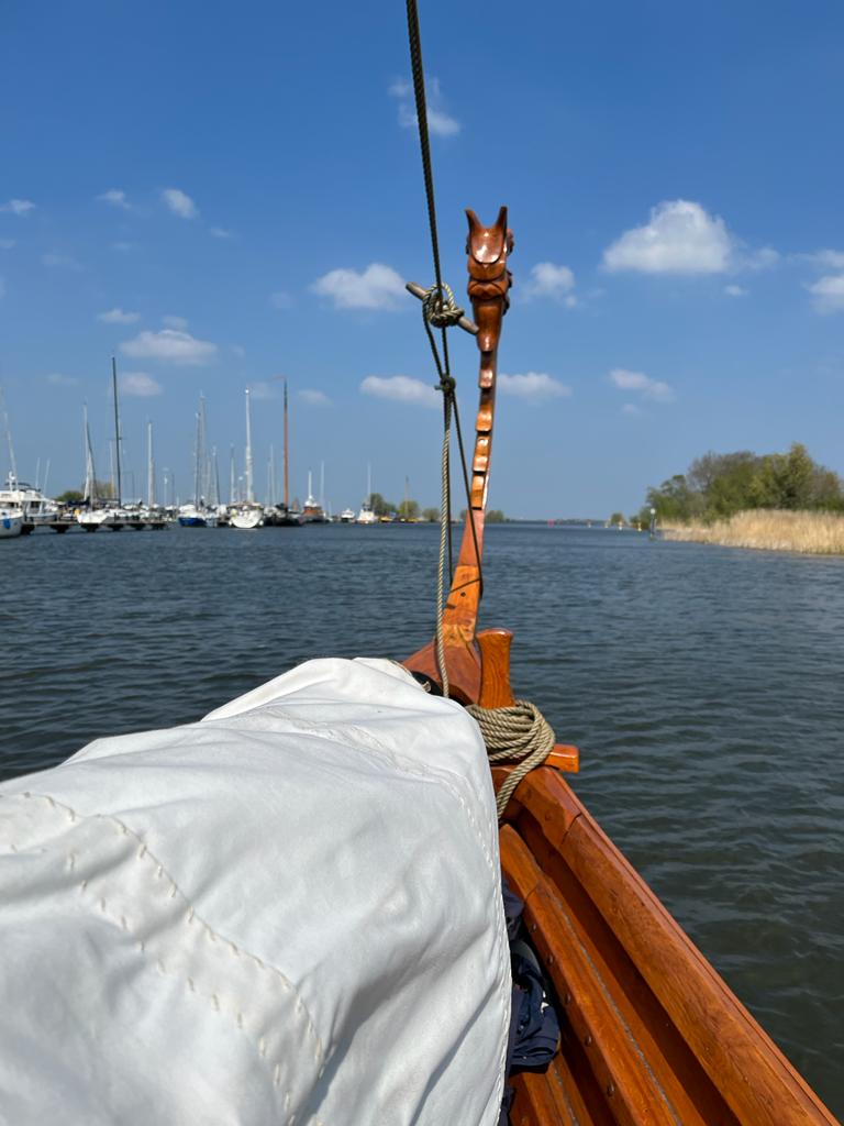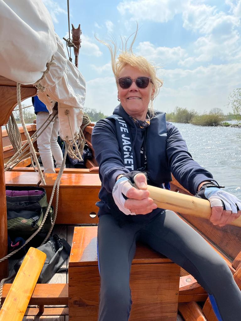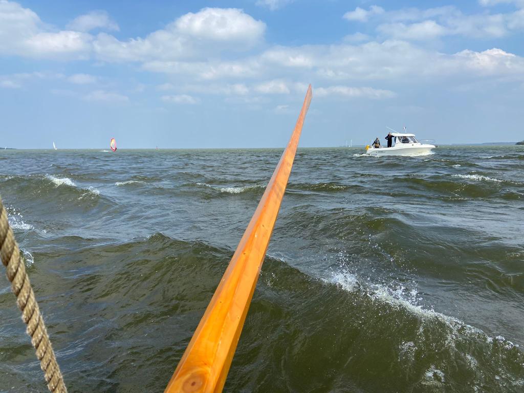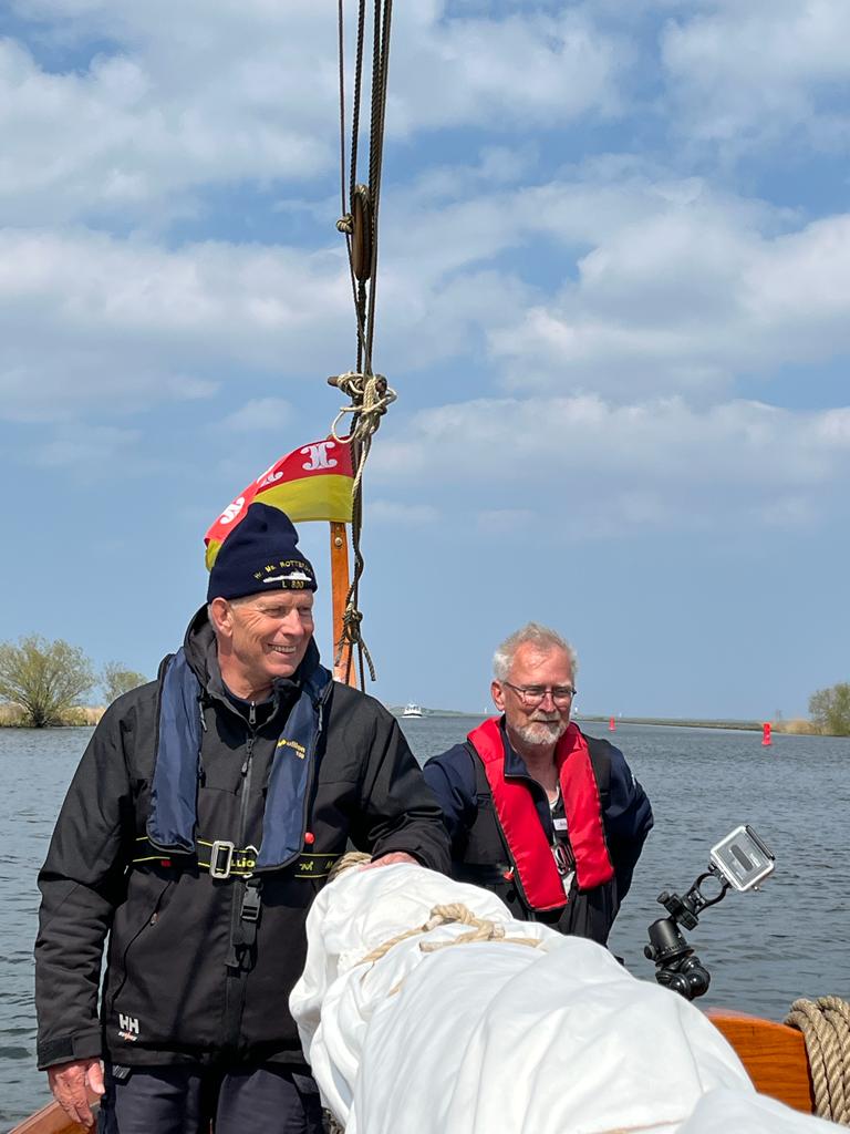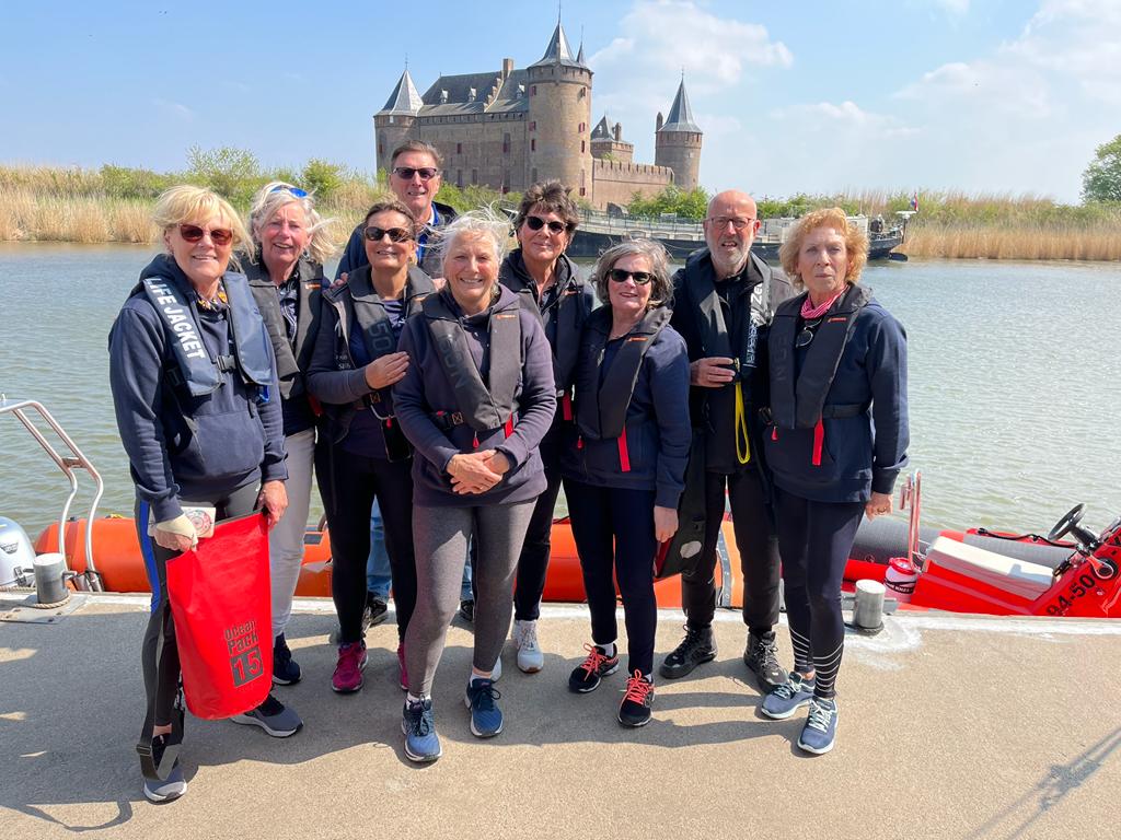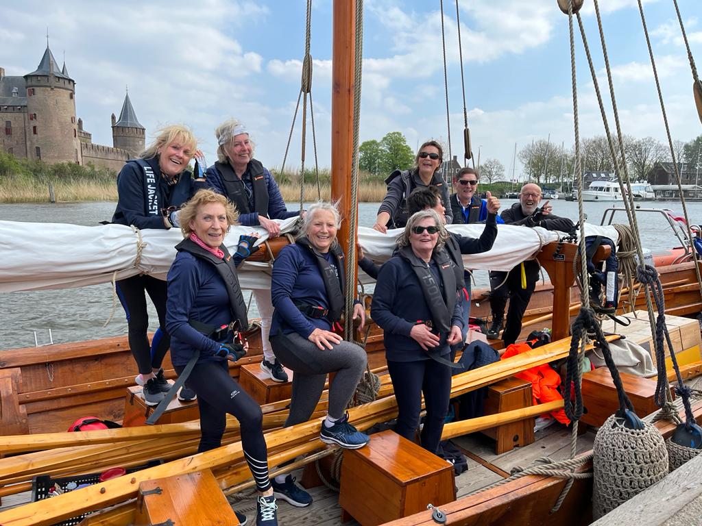 Stipt 9.00 uur: alle deelnemers op de steiger in de haven. De gigs lagen al klaar, op naar de palaver van Joyce. Alles duidelijk. Daarna iedereen op z’n bankje, bakboord of stuurboord: “slagklaar…riemen in het water “klaar en go”. De tocht begon. Vanuit het Huizerhoofd, het Gooimeer oversteken (windje in de rug) naar de sluis in Almere Haven. De sluis was al open, snel erin met de twee gigs en zakken maar. Een hele belevenis voor wie het nog niet eerder had meegemaakt.