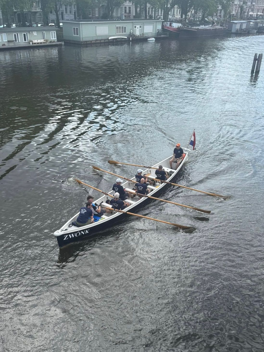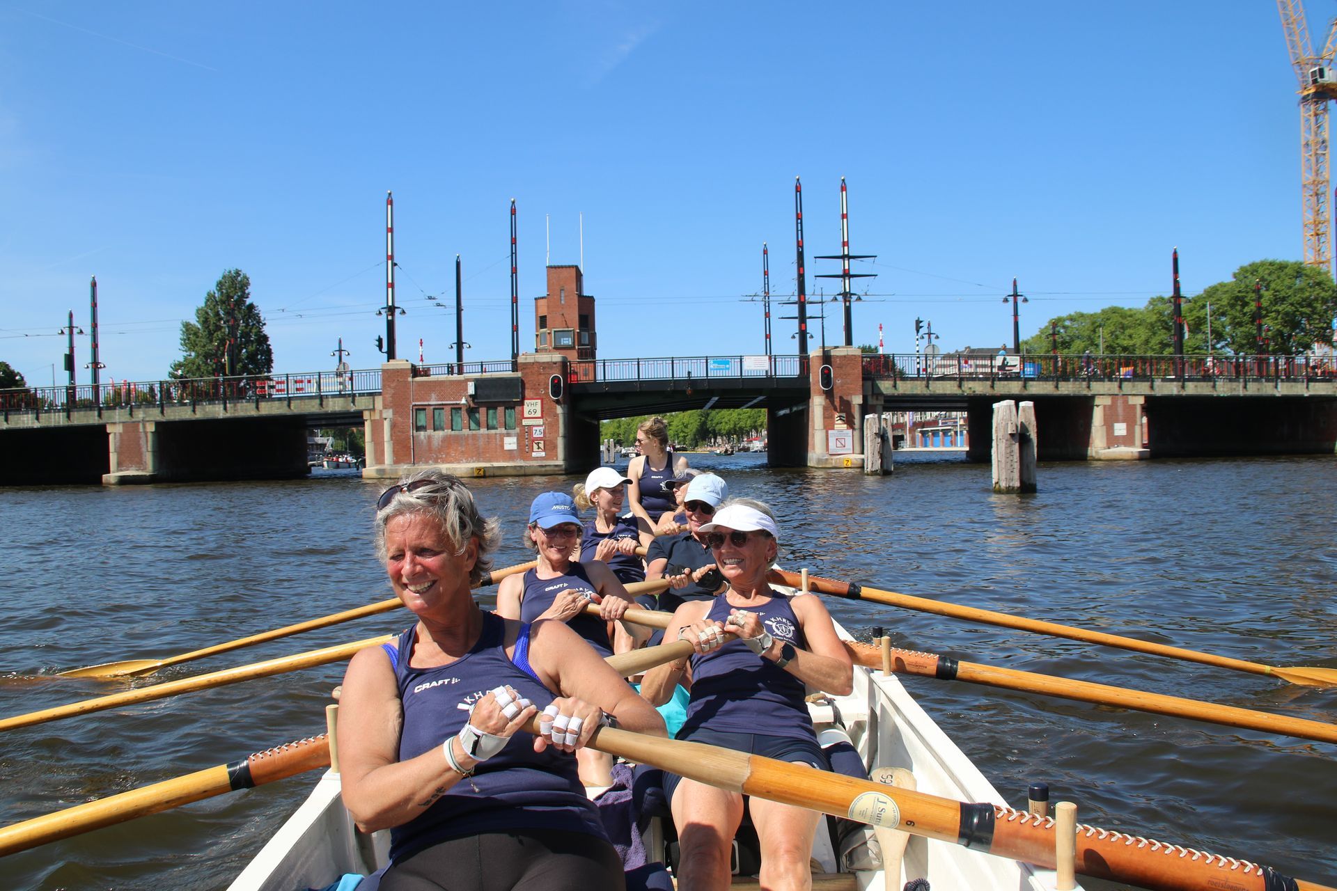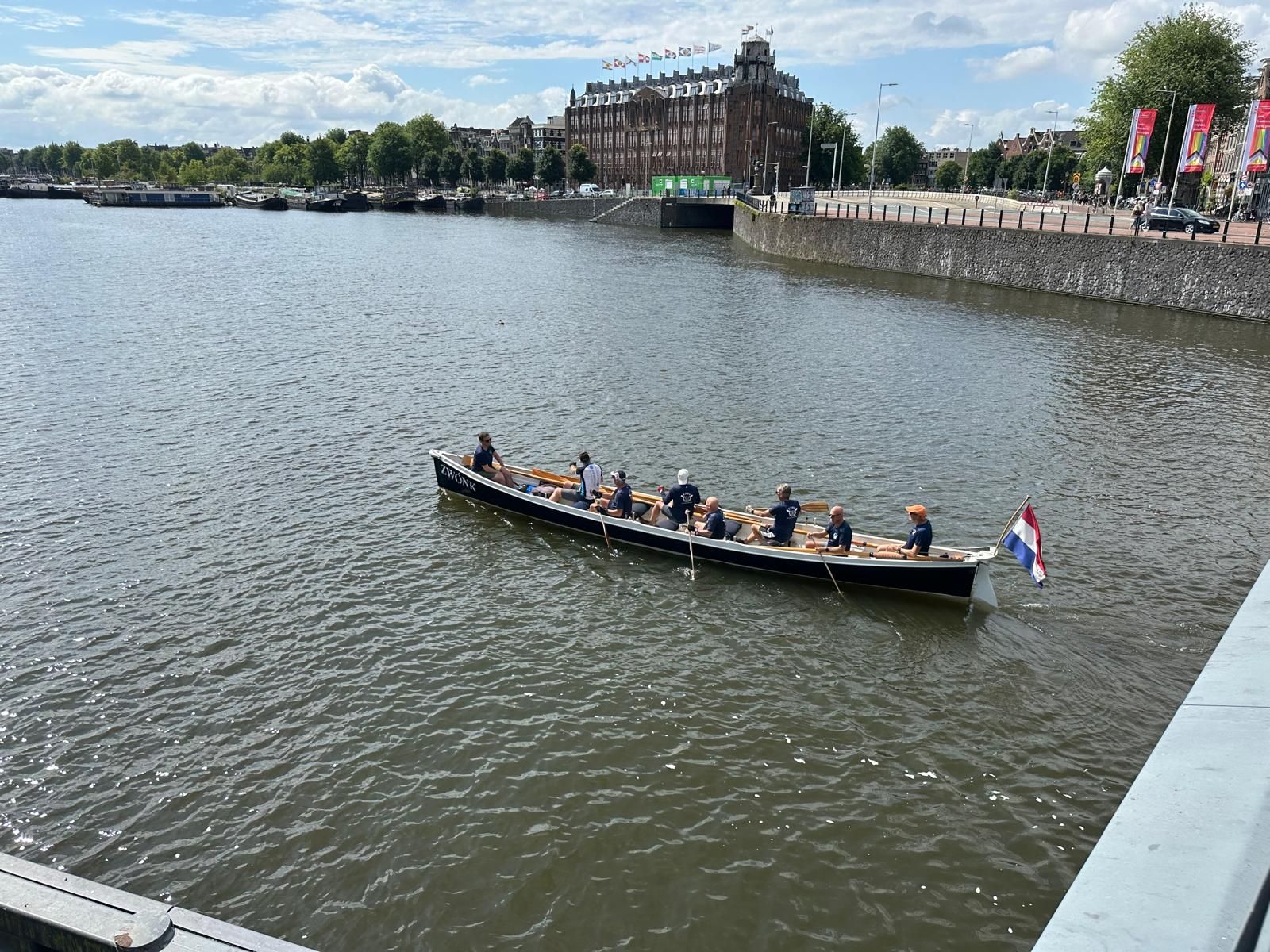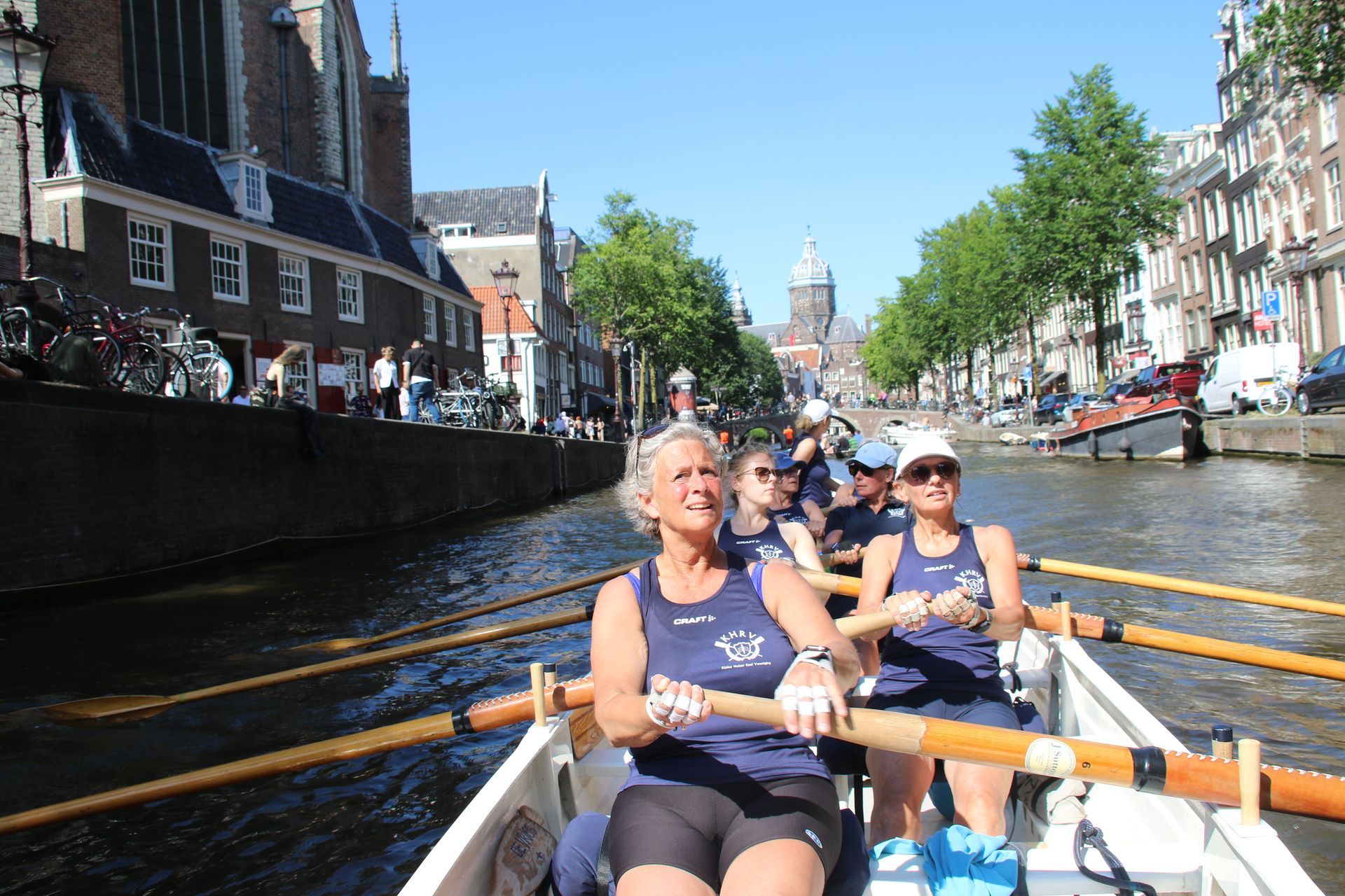 Wat een belevenis om door de grachten van Amsterdam te manoeuvreren, en dan bedoelen we ook echt manoeuvreren. Een aantal keer moesten ze de riemen plat leggen en bewogen ze zich voort met kleine peddeltjes, omdat de bruggen te smal en te laag waren voor de riemen. Dankzij de ongelooflijk knappe stuurmanskunsten van stuurman Peter navigeerden ze veilig door de extreme drukte van de Amsterdamse grachten.