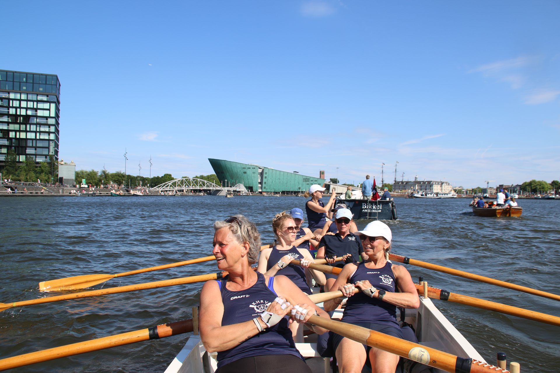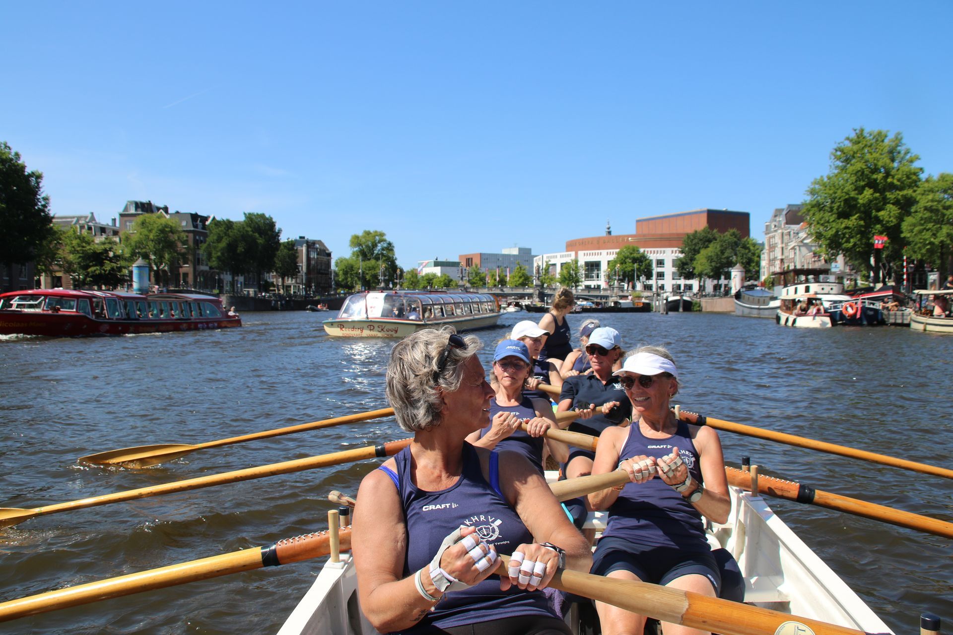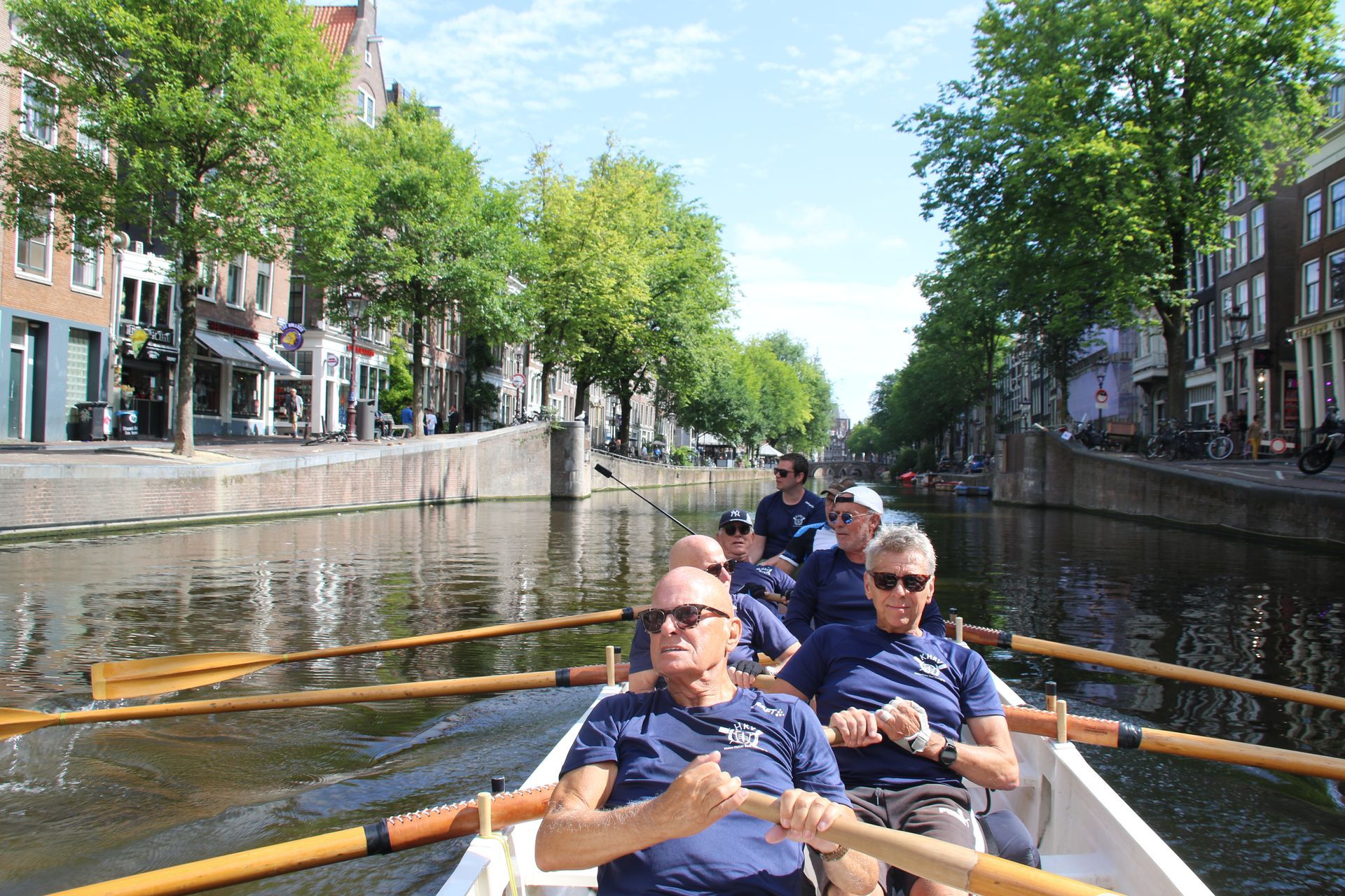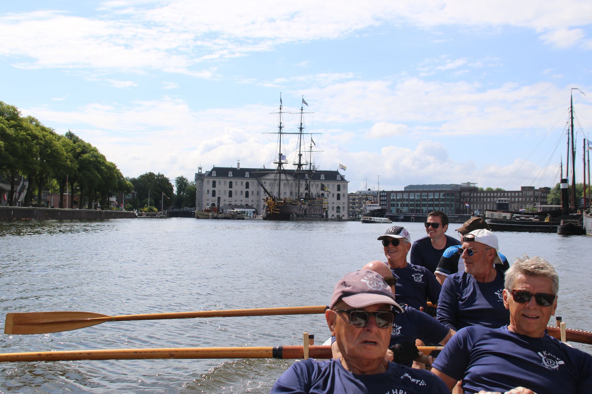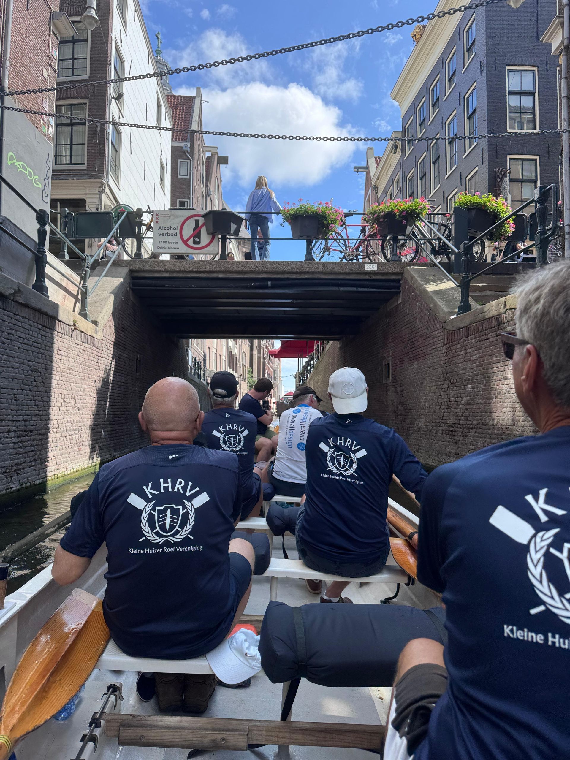 Wat een belevenis om door de grachten van Amsterdam te manoeuvreren, en dan bedoelen we ook echt manoeuvreren. Een aantal keer moesten ze de riemen plat leggen en bewogen ze zich voort met kleine peddeltjes, omdat de bruggen te smal en te laag waren voor de riemen. Dankzij de ongelooflijk knappe stuurmanskunsten van stuurman Peter navigeerden ze veilig door de extreme drukte van de Amsterdamse grachten.