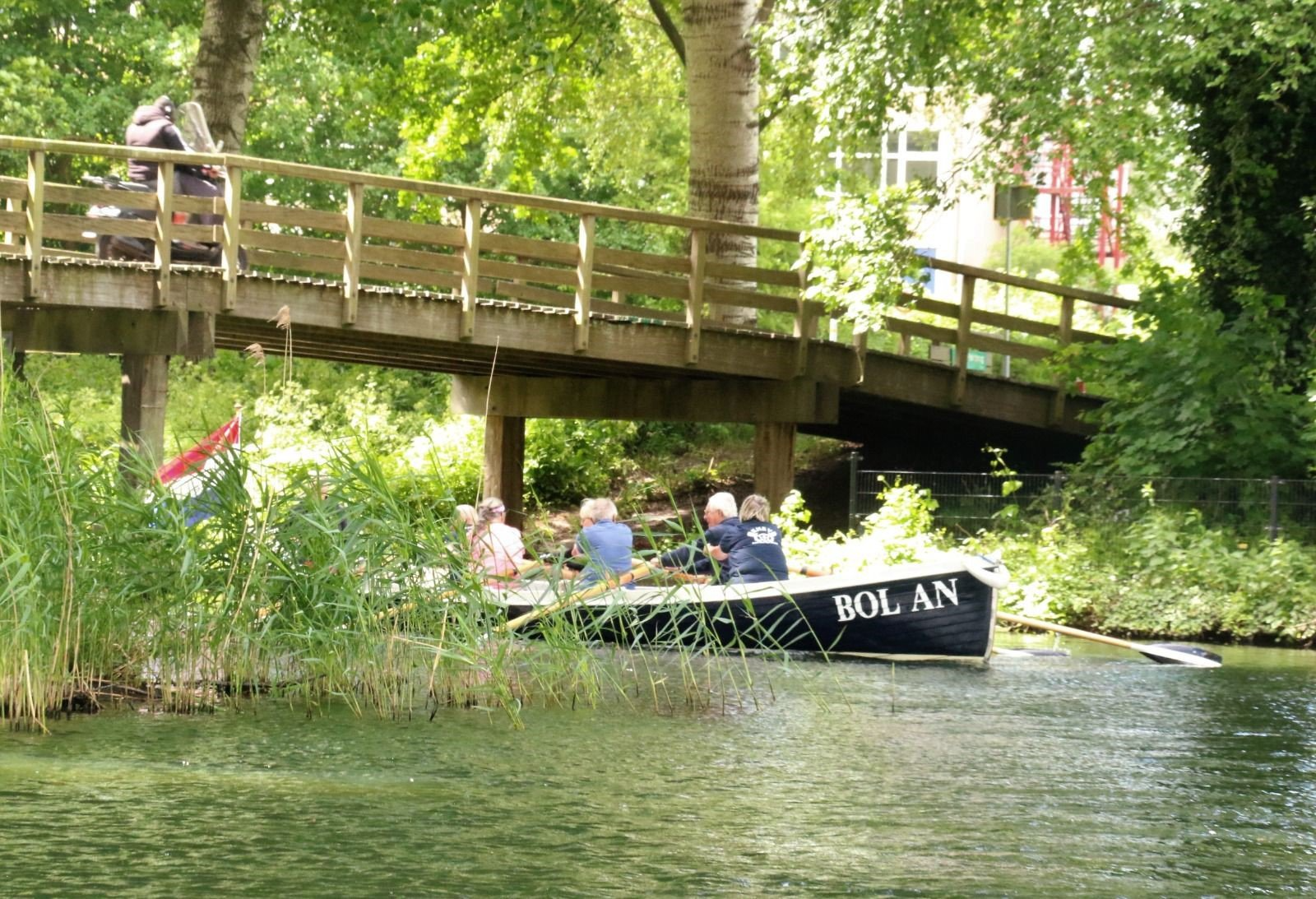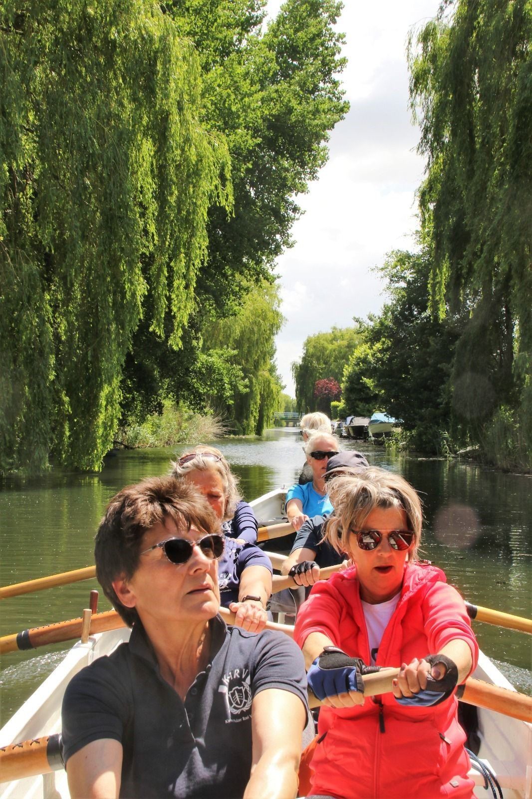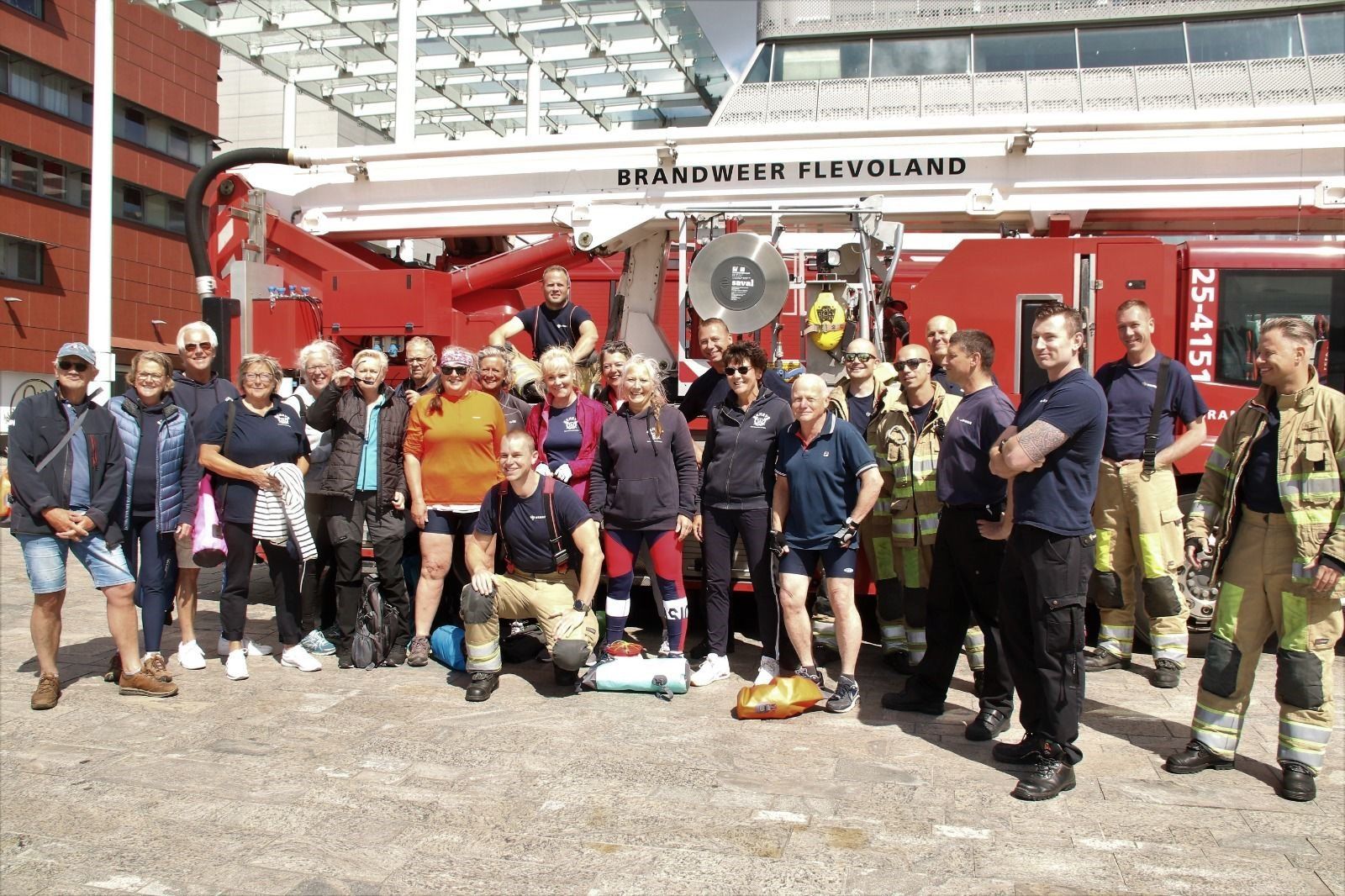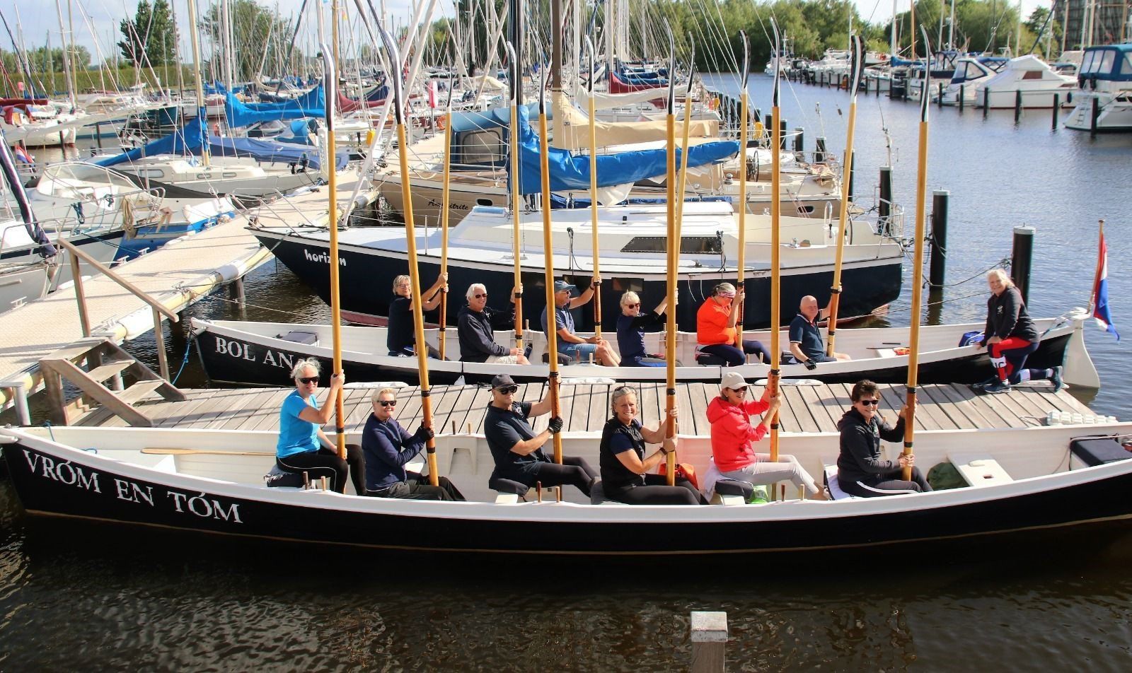 Stipt 9.00 uur: alle deelnemers op de steiger in de haven. De gigs lagen al klaar, op naar de palaver van Joyce. Alles duidelijk. Daarna iedereen op z’n bankje, bakboord of stuurboord: “slagklaar…riemen in het water “klaar en go”. De tocht begon. Vanuit het Huizerhoofd, het Gooimeer oversteken (windje in de rug) naar de sluis in Almere Haven. De sluis was al open, snel erin met de twee gigs en zakken maar. Een hele belevenis voor wie het nog niet eerder had meegemaakt.