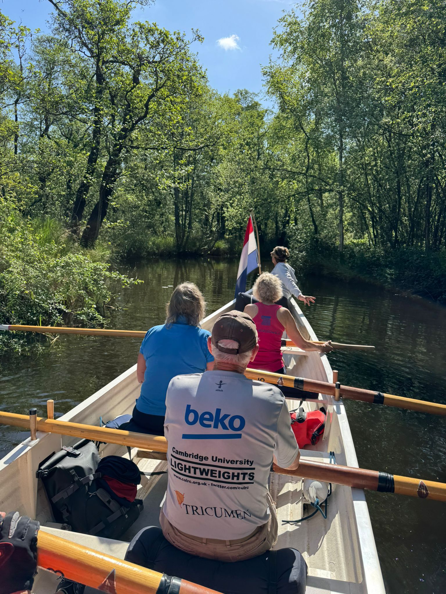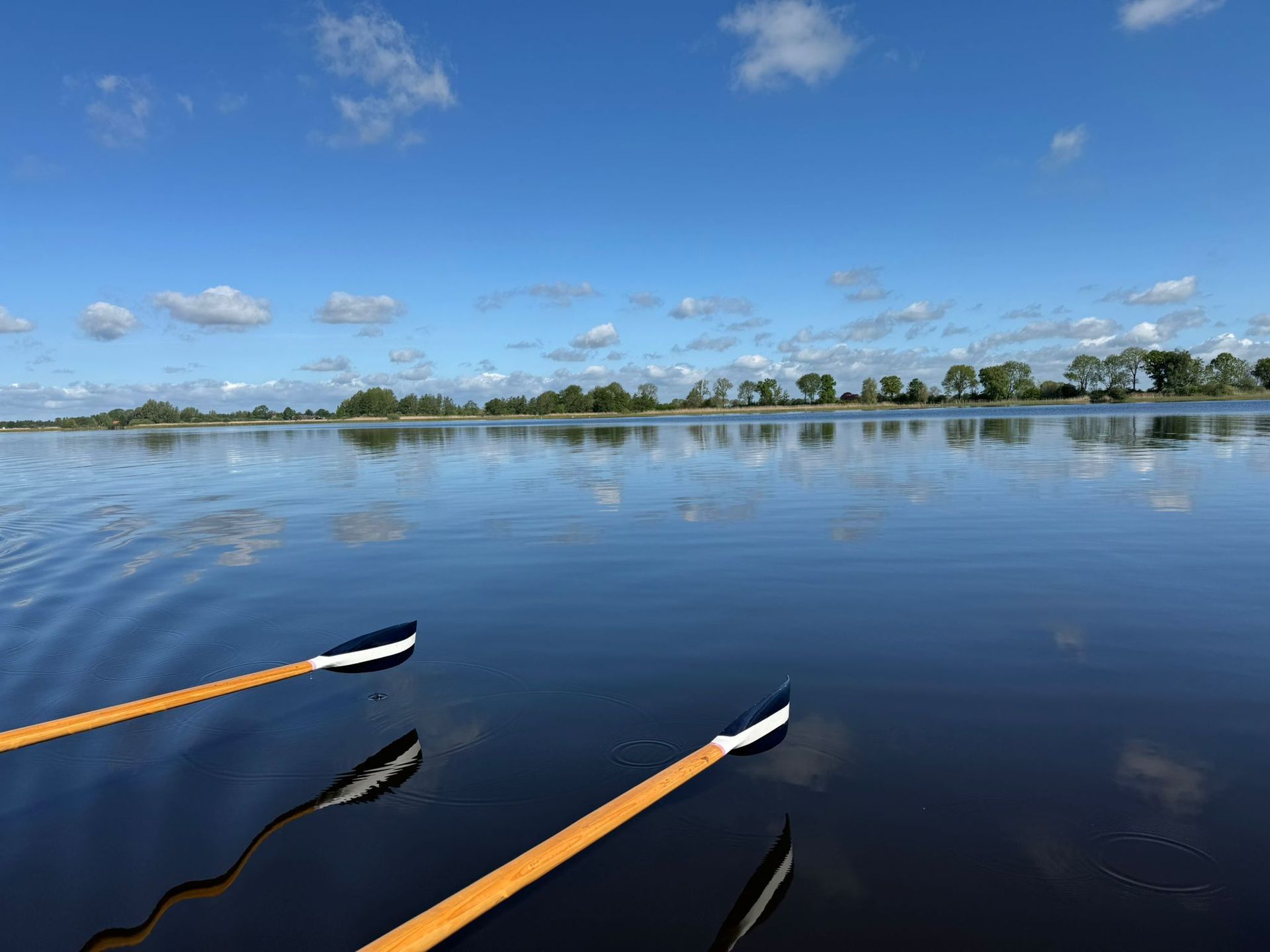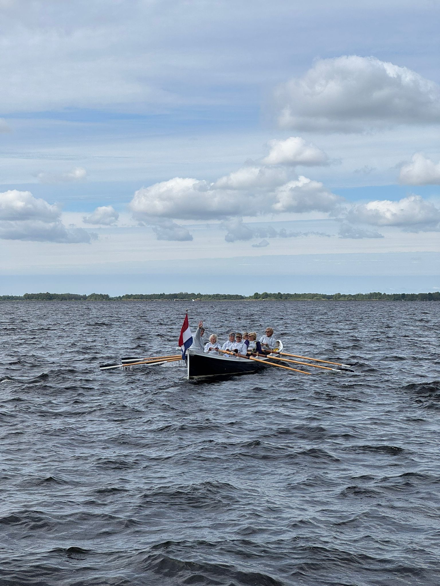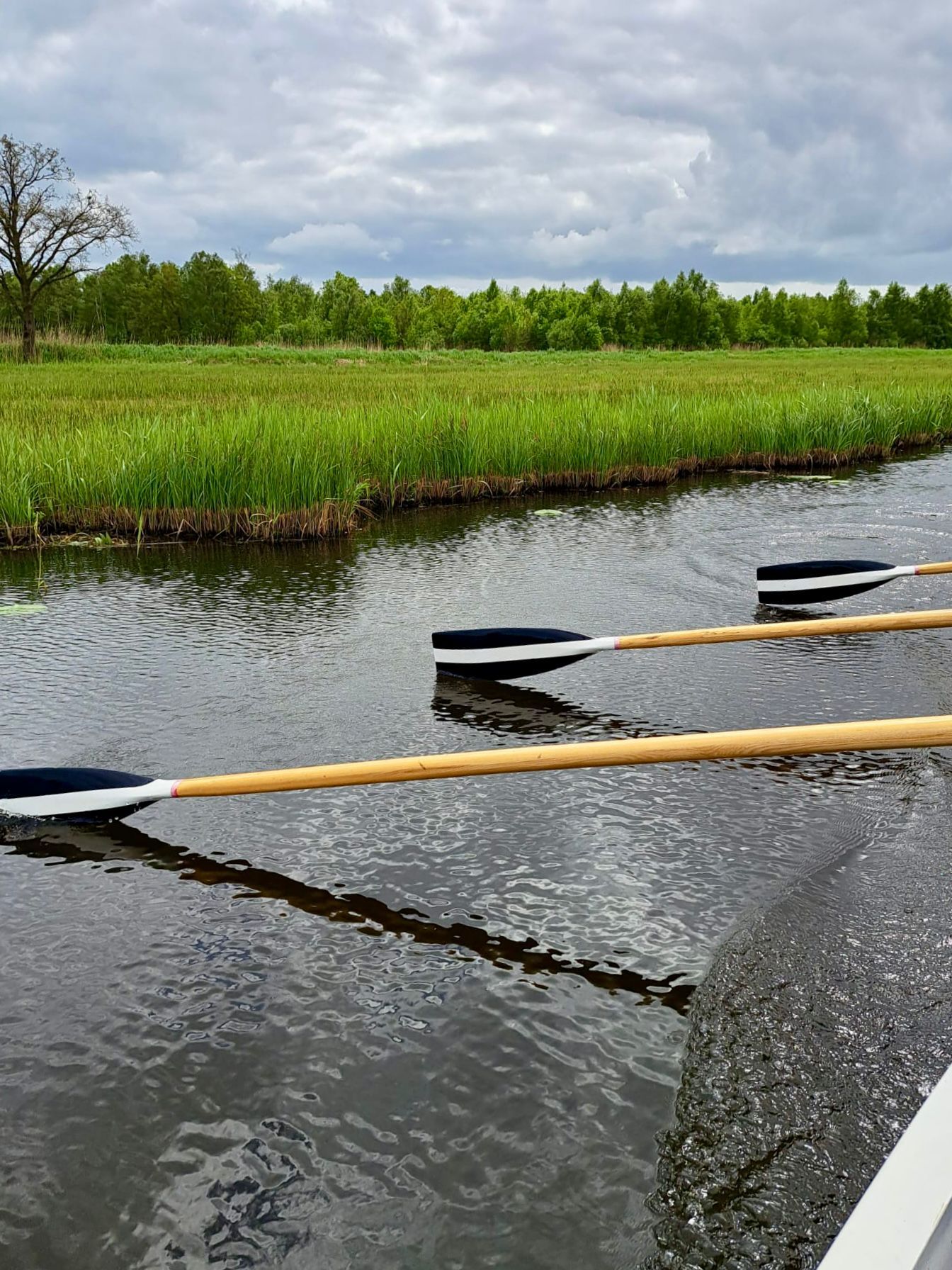 Zondag was het een stuk frisser met flinke wind, maar nog altijd heerlijk roeiweer. Voor koffie meerden we aan in Kalenberg. Daarna genoten we nog van de wereld van de ribben en het riet, door smalle kanaaltjes en lage bruggetjes waar we alleen maar liggend/bukkend onderdoor konden. Maar aan al het goede komt een end en rond 15 uur waren we weer bij de helling en ging de “VROM EN TOM” vlotjes op de trailer en terug naar Huizen.